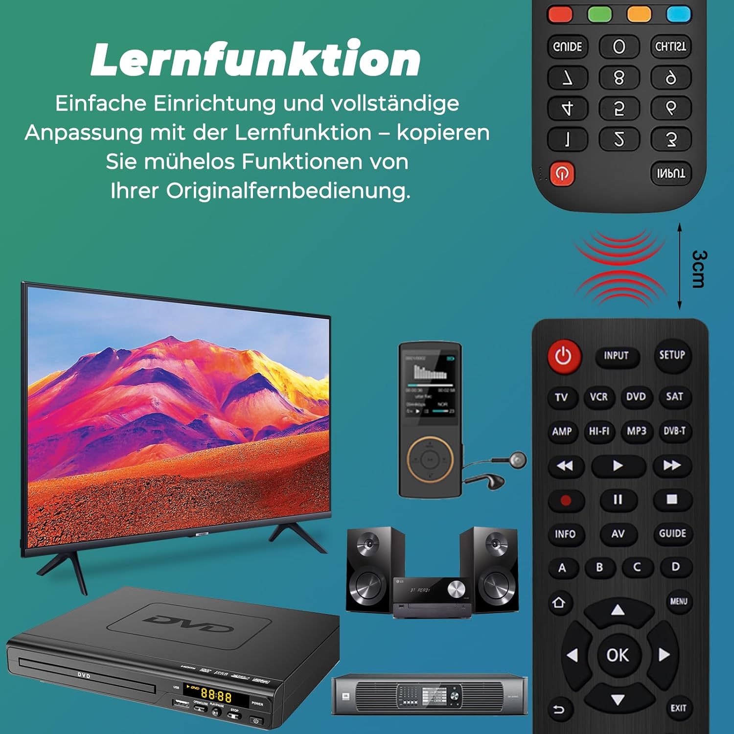 • Функция за обучение: персонализирайте вашето универсално дистанционно управление без усилие с функцията за обучение. Лесно копирайте функции от оригиналното си дистанционно управление, за да можете да замените липсващи или повредени бутони. Идеално за настройване на контролите според вашите нужди, за да осигурите безпроблемна работа и съвместимост с множество устройства. Лесната настройка го прави идеално за всички потребители!