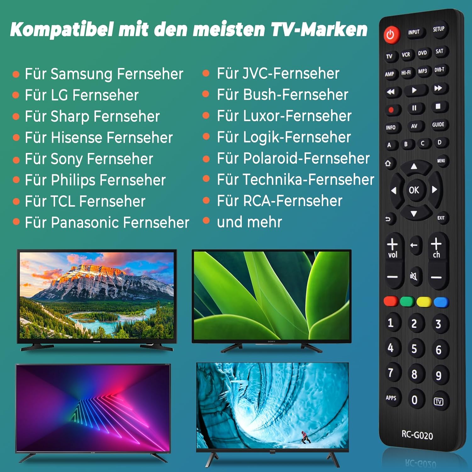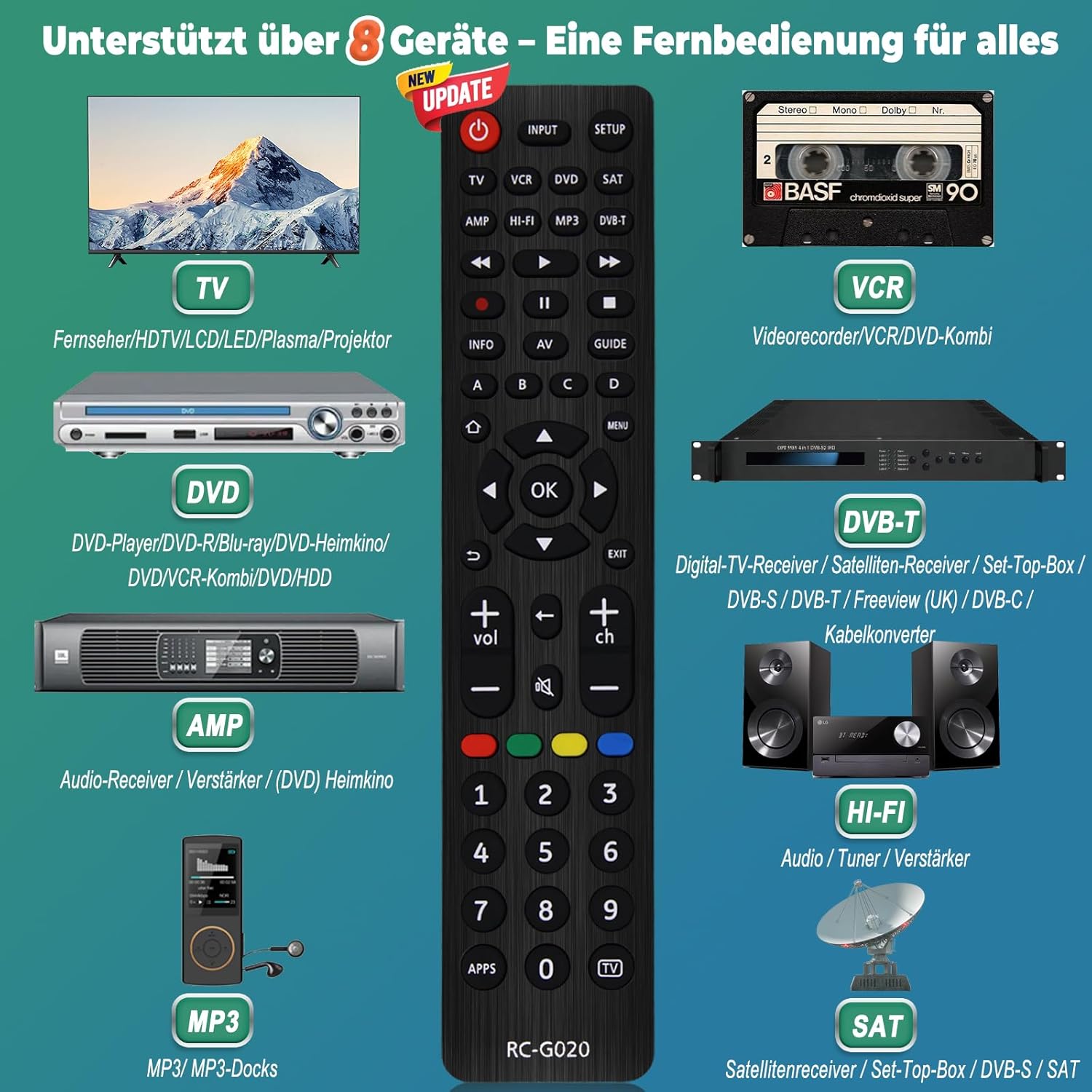 • 8 В 1 УНИВЕРСАЛНО ДИСТАНЦИОННО УПРАВЛЕНИЕ Това многофункционално универсално дистанционно управление може да управлява 8 различни типа устройства - всички телевизори, саундбари/аудио системи, системи за домашно кино, телевизори, DVD/Blu-ray плейъри, кабелни/сателитни системи, стрийминг медийни плейъри, цифрови приемници, HDTV, IPTV, DVB-T, цифрови телевизионни приемници, Freeview (UK), MP3 и други. То е съвместимо с всички марки телевизори и покрива всички функции на вашето старо, оригинално дистанционно за телевизор, така че може да бъде заменено безпроблемно.