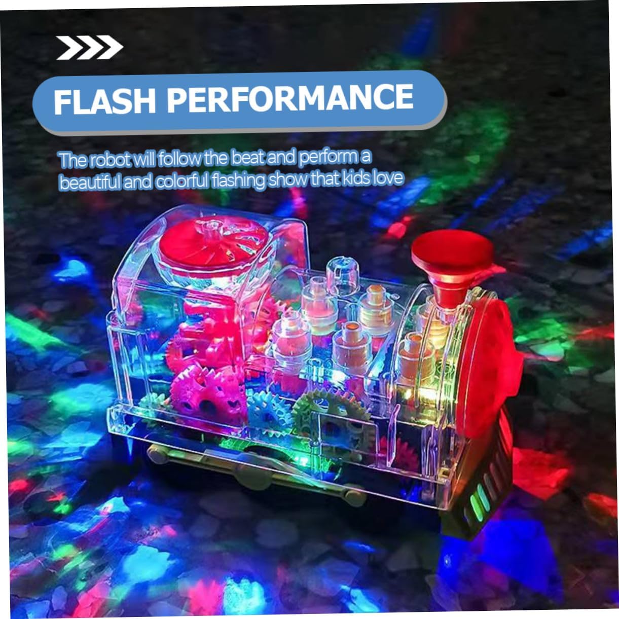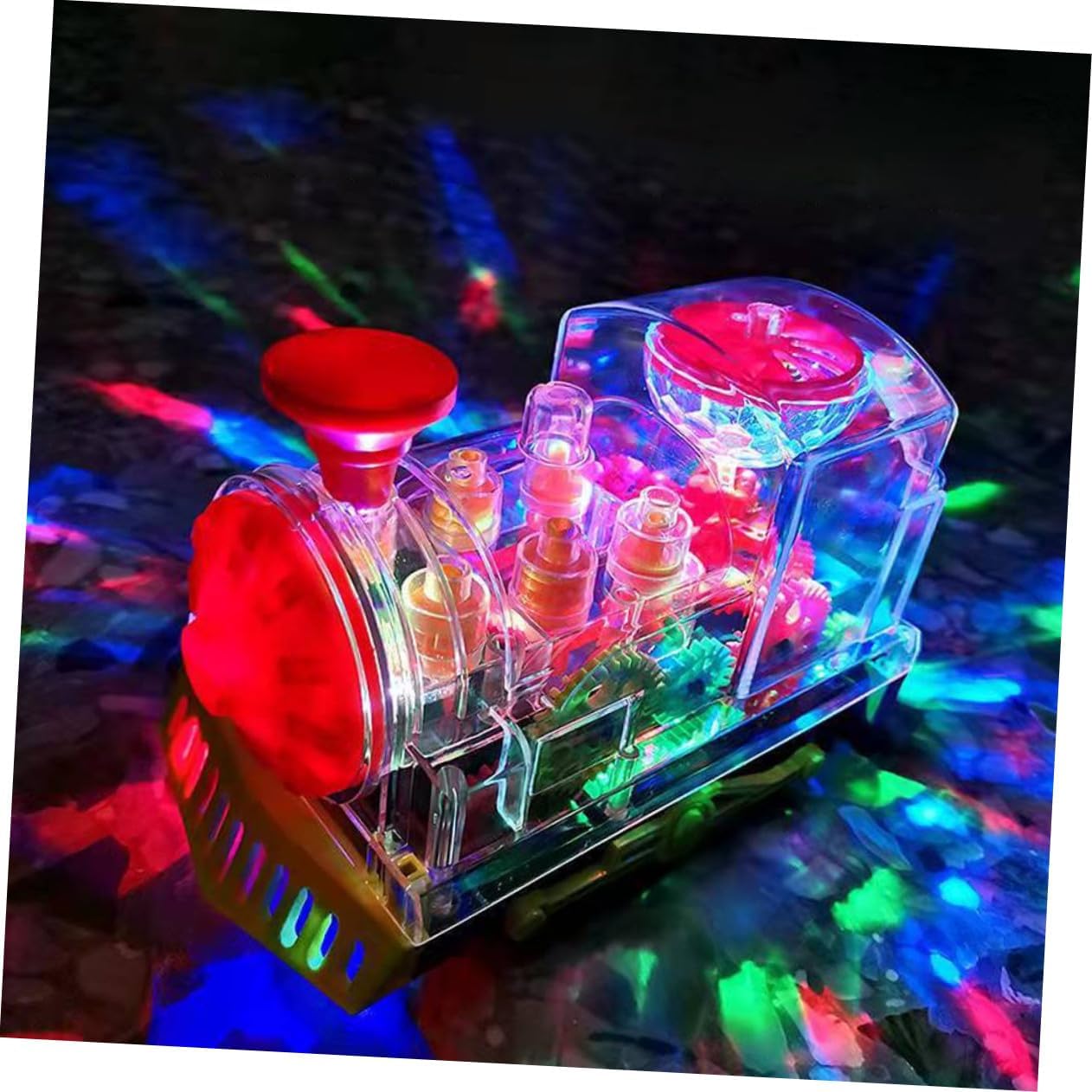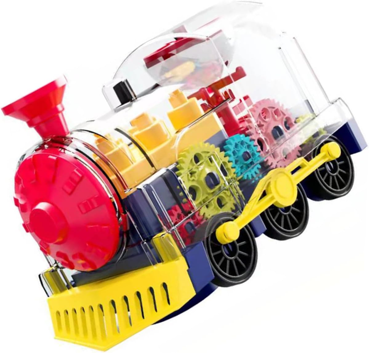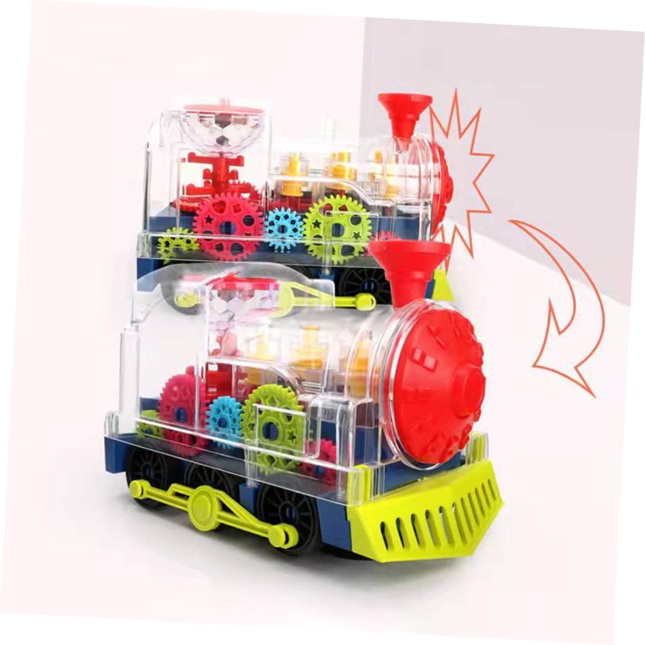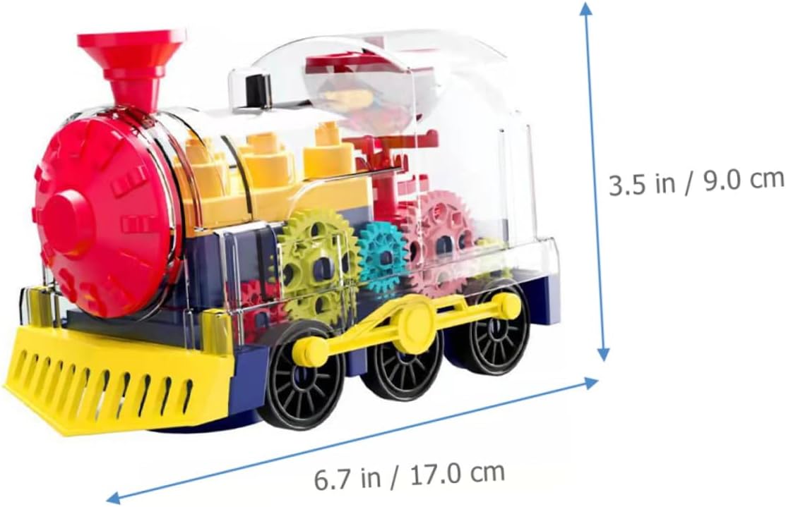 - Прозрачен корпус на модела на електрическата железница, ясно се виждат цветните зъбни колела вътре. Имитация на железница за.