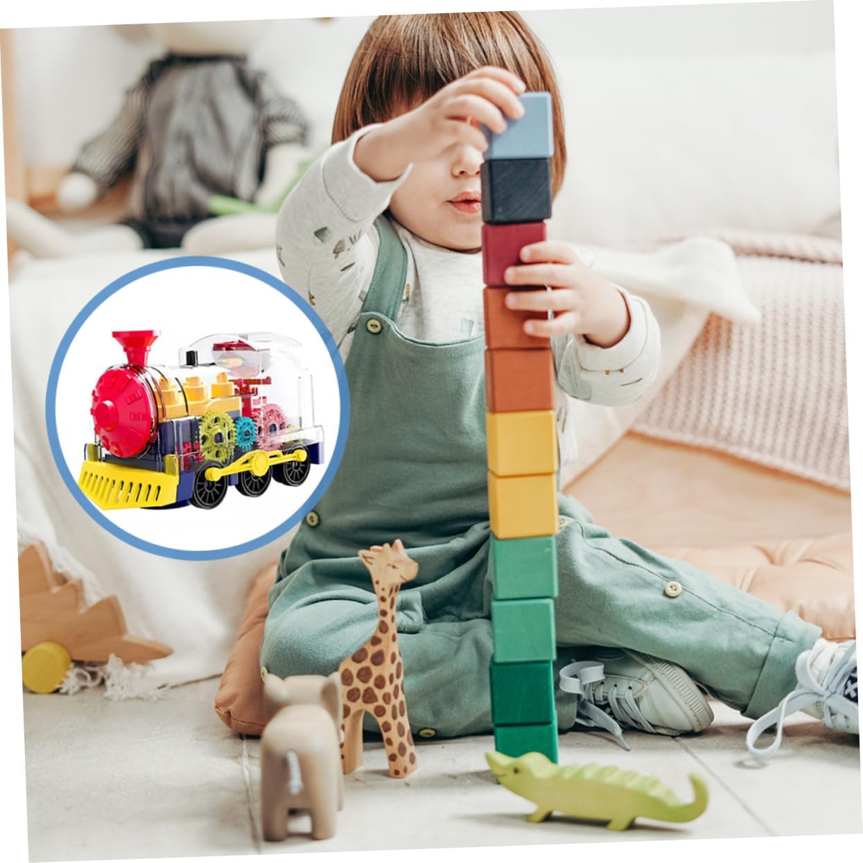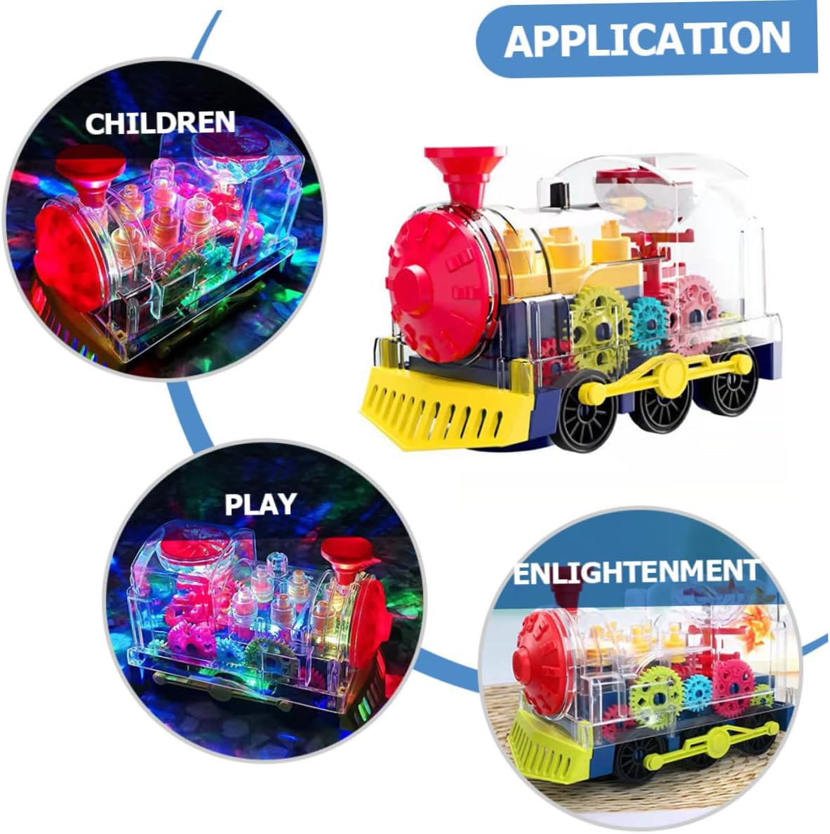 - Играчката влакче за ранно образование може да има въртящи се на 360 градуса универсални колела, подвижна е и може да издава звука на истински модел на влак.