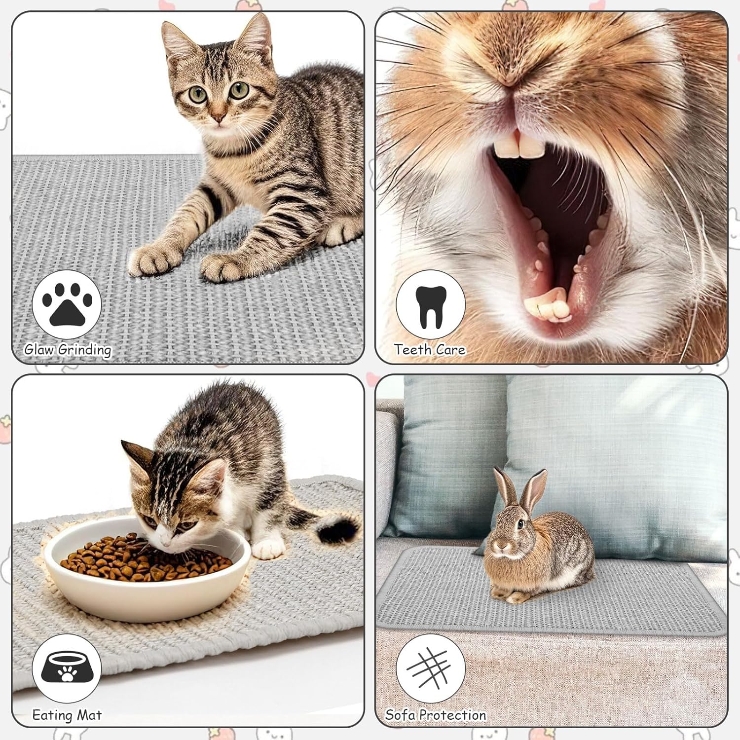 Dieses Kratzmatte Kaninchen Set ist nicht nur ein Krallenschärfer, sondern hilft Kaninchen auch dabei, ihre Zähne zu schärfen und zu spielen. Kombinieren Sie die Kratzmatte mit dem Spielzeug Ihres Kaninchens, indem Sie beispielsweise Heu oder Leckerlis darauf platzieren, um Ihr Kaninchen zum aktiven Erkunden und Spielen zu animieren und so seinen Tagesablauf zu bereichern.