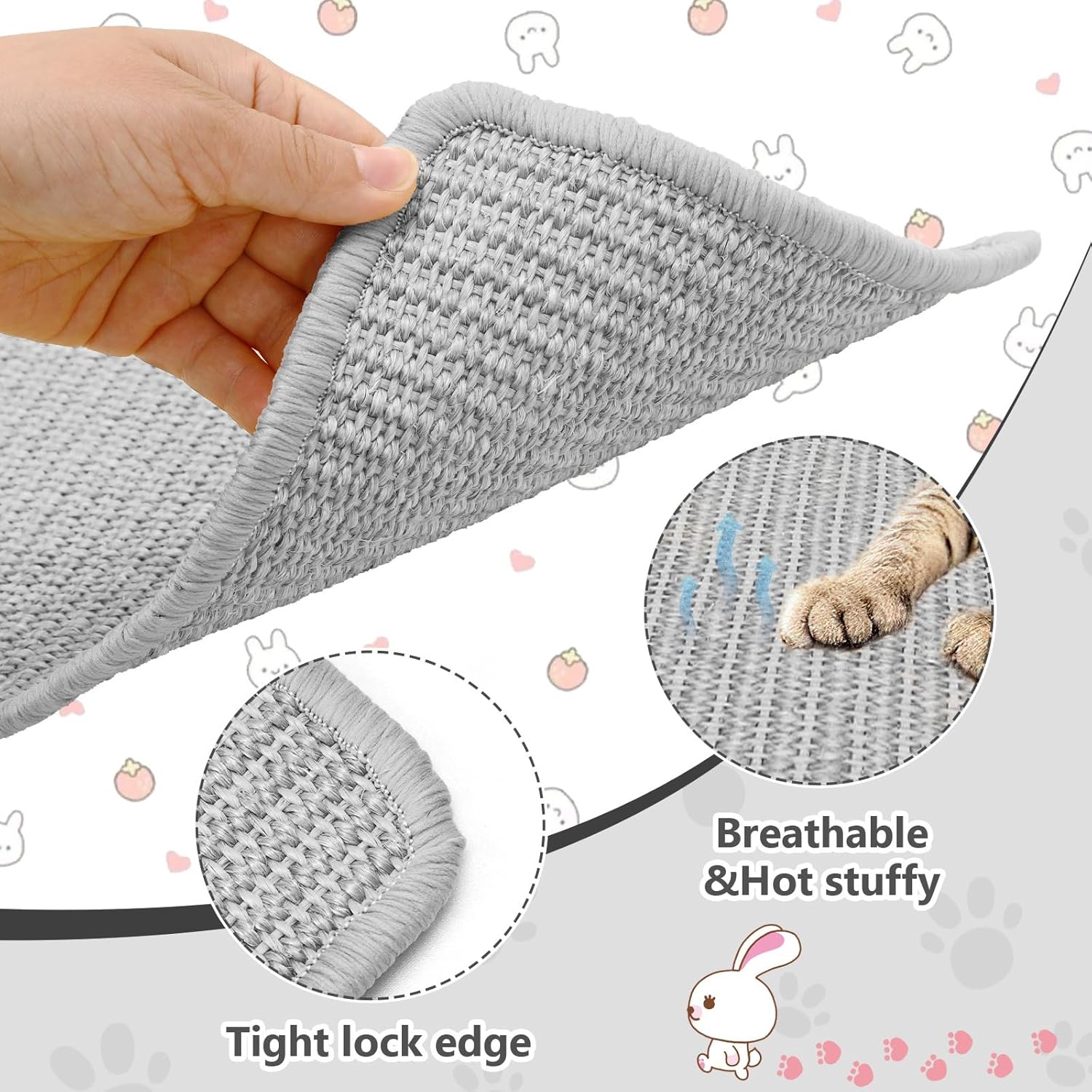 Unsere Kaninchen Kratzmatte besteht aus Sisalmaterial, das eine hervorragende Haltbarkeit und Atmungsaktivität aufweist und sich auch sehr gut für den Einsatz im Sommer eignet. Das Kaninchen Zubehör kann als Fußstütze und Bett für Ihr Haustier verwendet werden. Durch das Klettverschluss Design auf der Rückseite des Kaninchen Krallens kann Kratzmatte Kaninchen an jeder beliebigen Stelle befestigt werden, verrutscht nicht leicht und bleibt während der Verwendung durch das Haustier stabil.