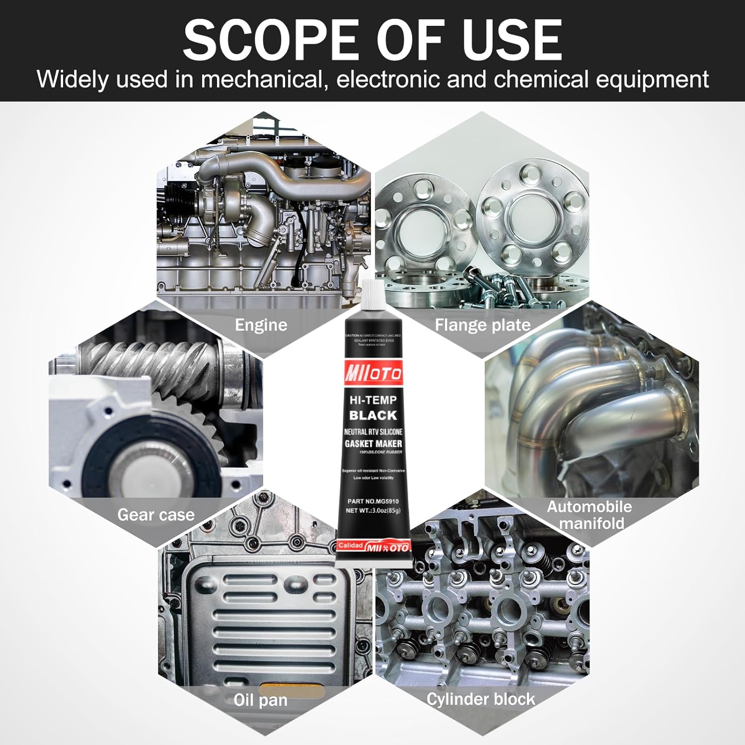 • [Уплътнител за двигател]: Високотемпературен силикон, синтезиран с помощта на съвременна технология, използващ силиконов каучук като основна суровина. Втвърдява се в гъвкав гел, който може да замени конвенционалните уплътнения от корк, филц, гума и хартия и да запълни дупки и драскотини.