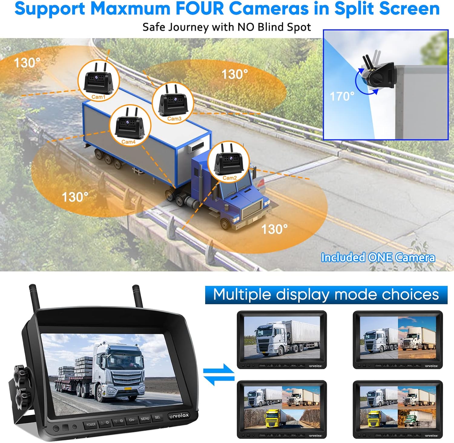• Поддържа 4 камери на разделен екран: Безжичната камера за задно виждане може да добави максимум четири камери и да показва в различни режими на показване. Изображението на монитора може да се завърта за по-добро гледане, когато камерата е поставена отпред или отстрани на автомобила, което е добър помощник за премахване на мъртвата зона.