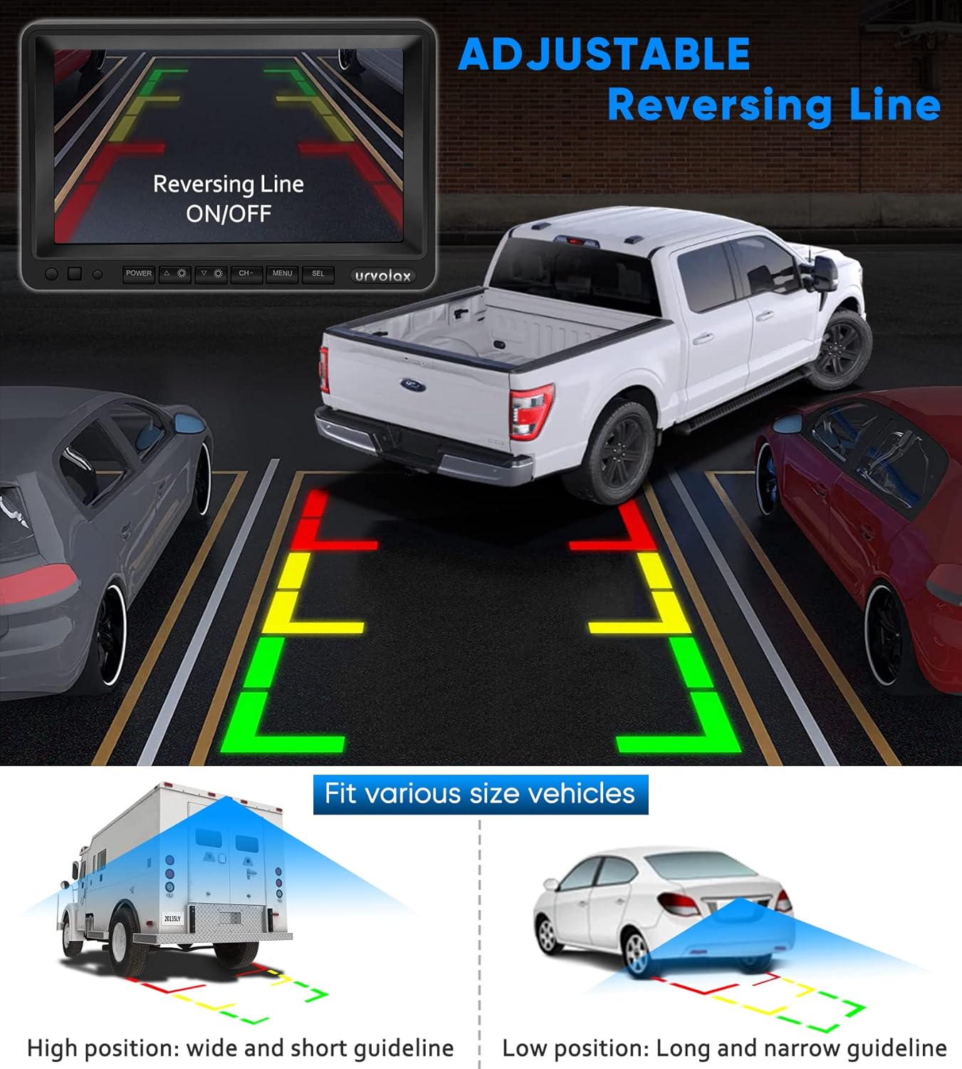 • Водоустойчива камера с регулируеми насочващи линии: Водоустойчивите камери за задно виждане IP69K с най-висок рейтинг могат да работят добре на открито дори при екстремни метеорологични условия от -20°C до 80°C (-4°C до 176°C). Насочващите линии могат да се включват/изключват или разстоянието може да се регулира спрямо различните превозни средства.