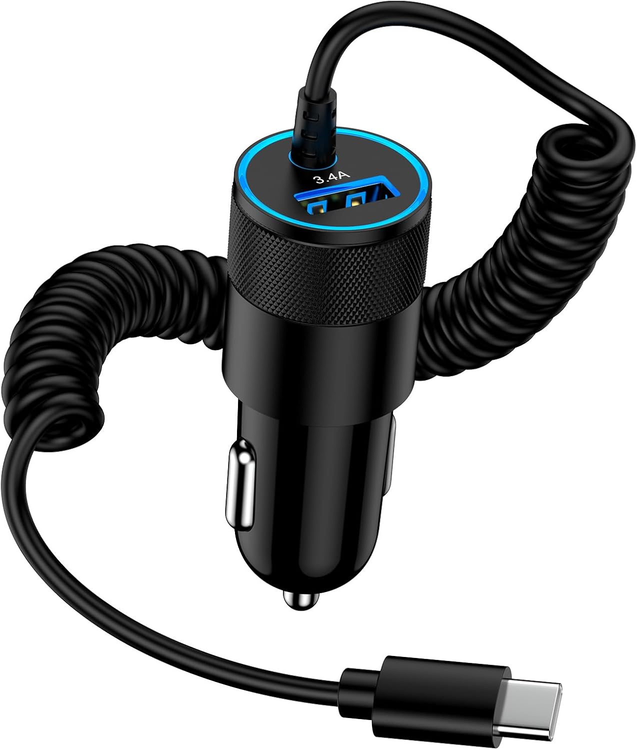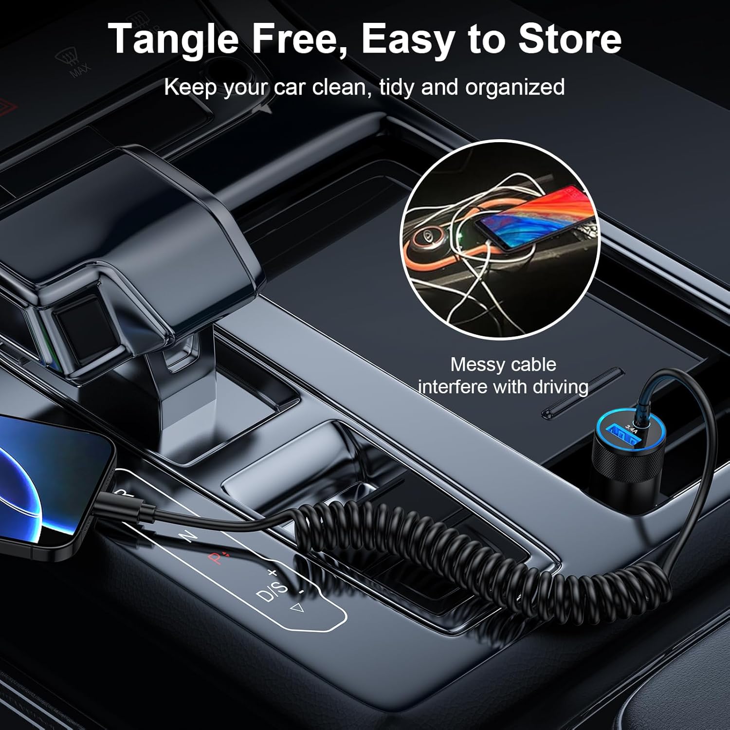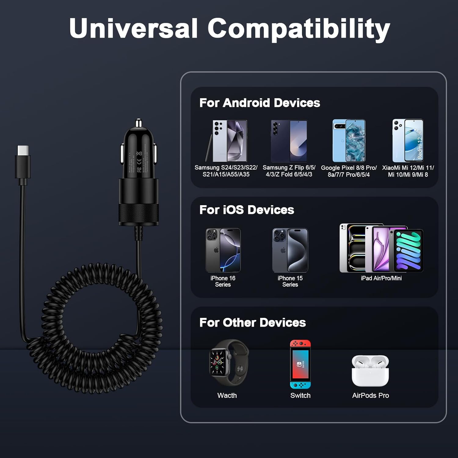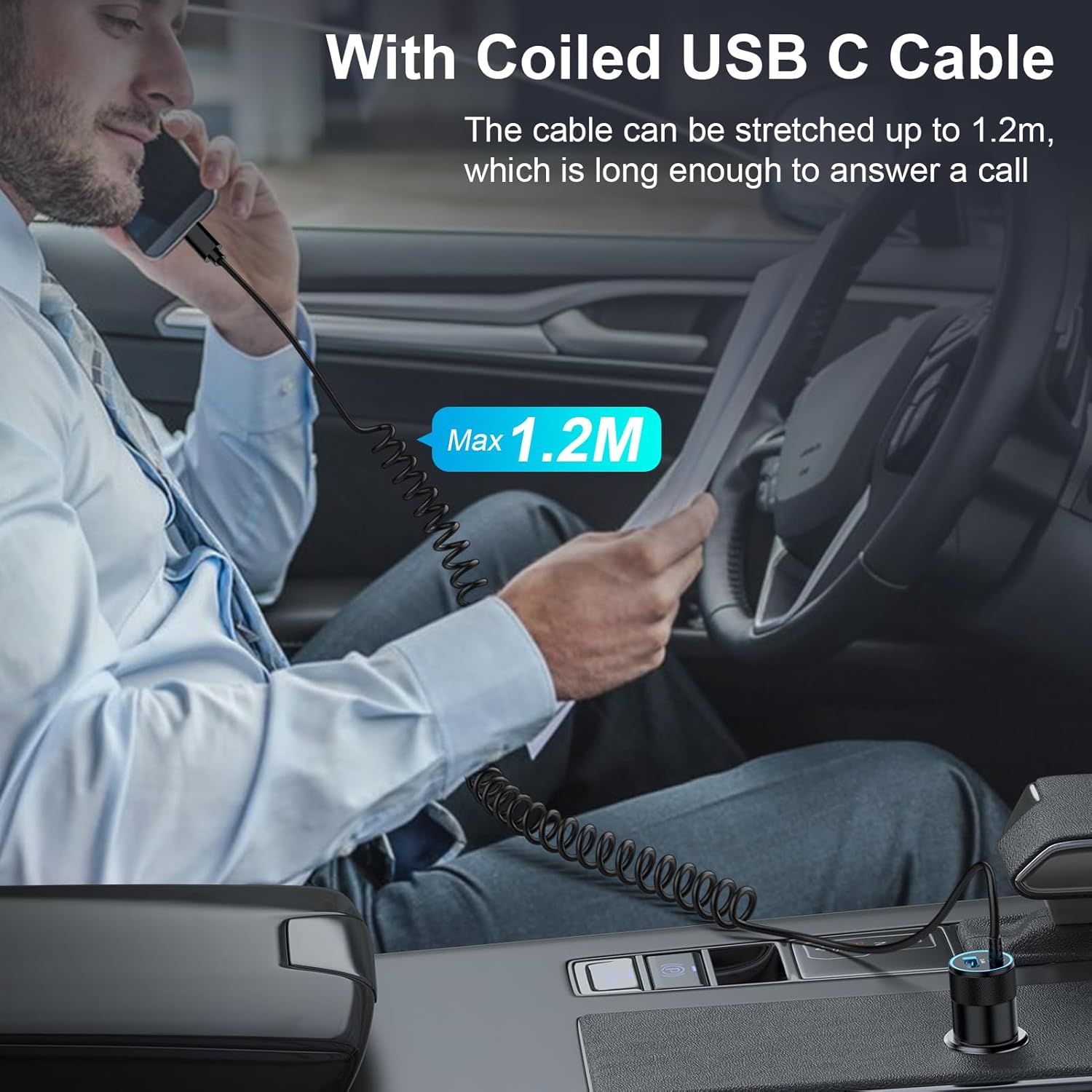 USB зарядно за запалка с 1,2 м USB C спирален кабел.