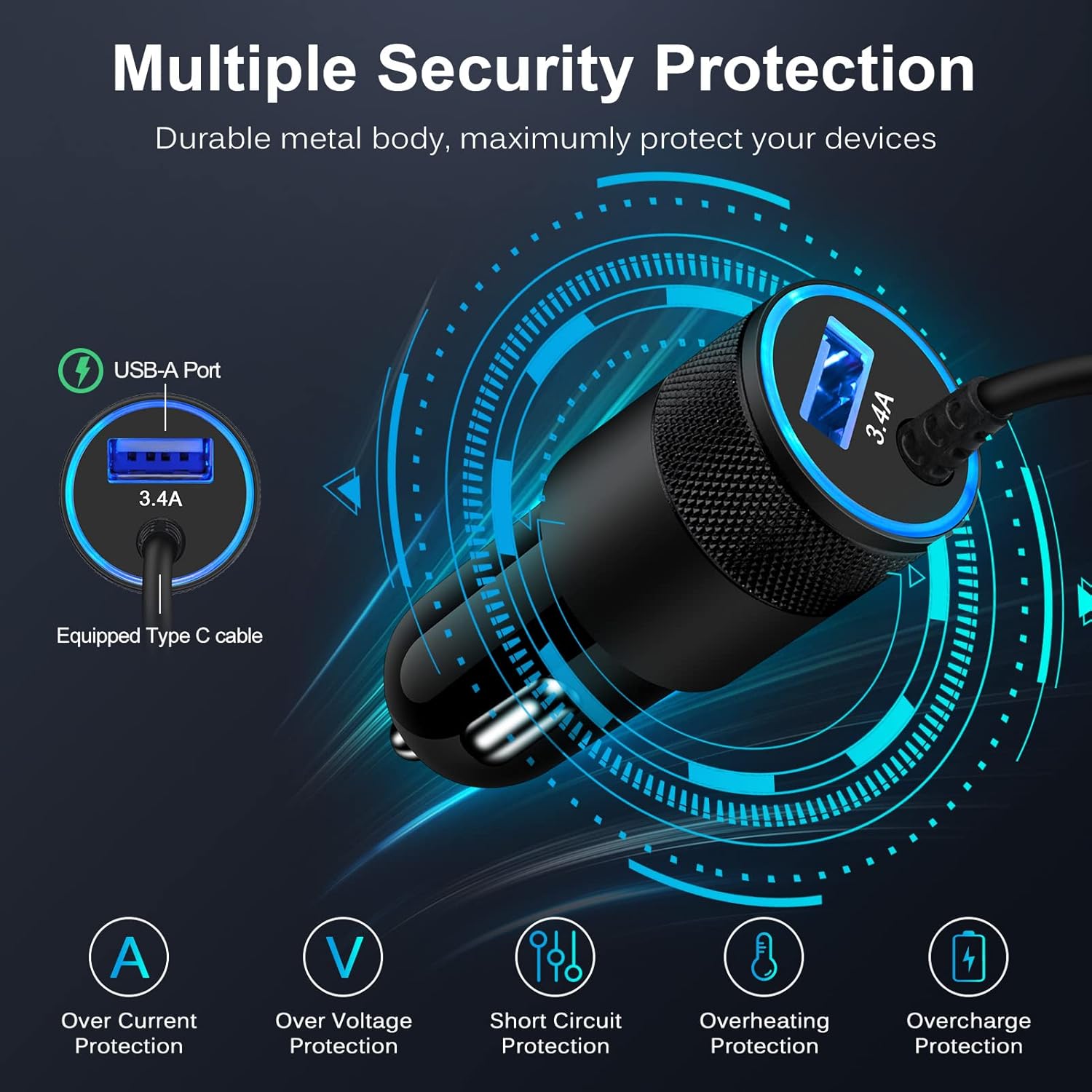 USB зарядно за запалка с 1,2 м USB C спирален кабел.