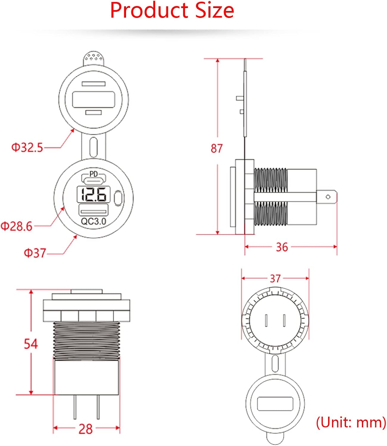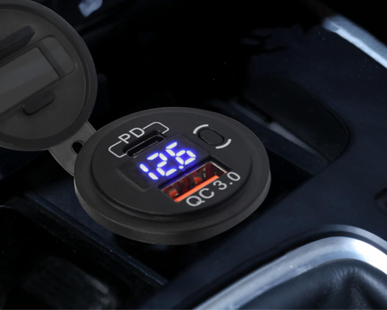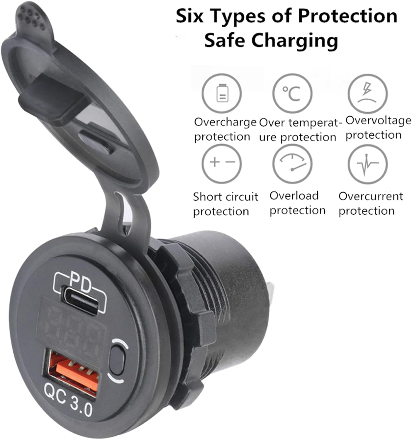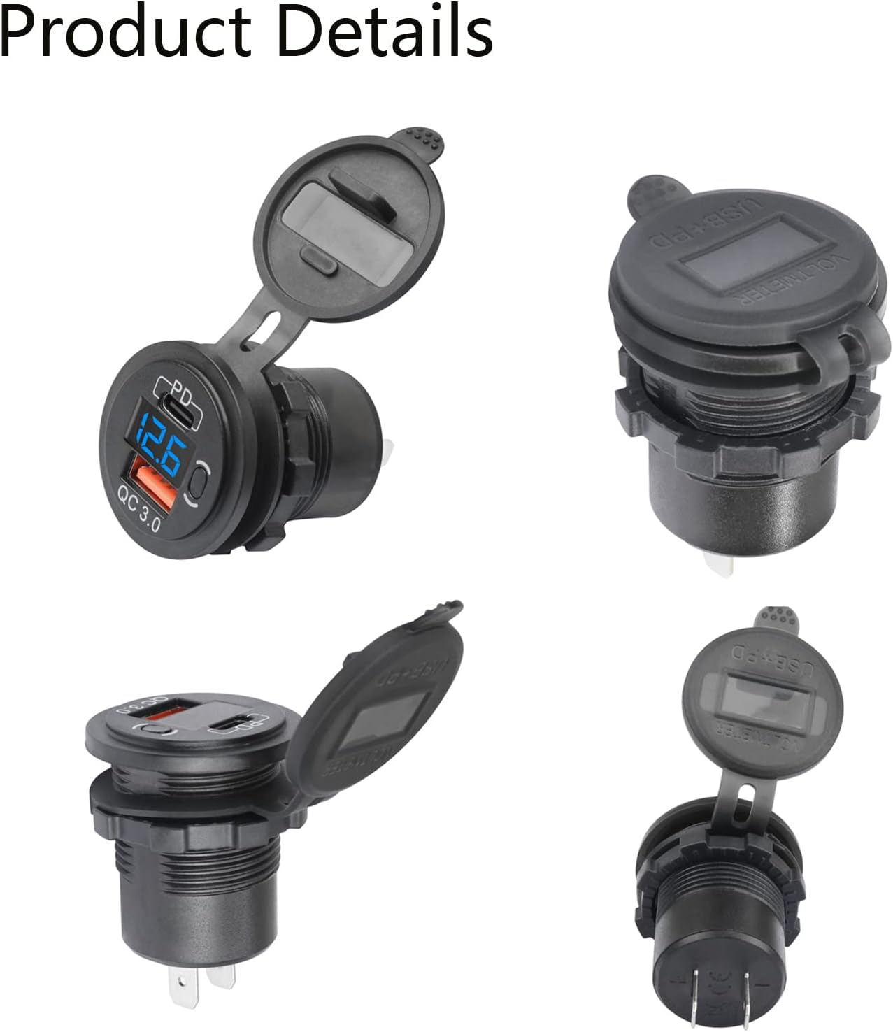 USB C PD гнездо 12 V/24 V, QC3.0 водоустойчив USB контакт за зареждане в кола с 23,6-инчов кабел, двойни портове за зареждане, LED цифров волтметър и превключвател