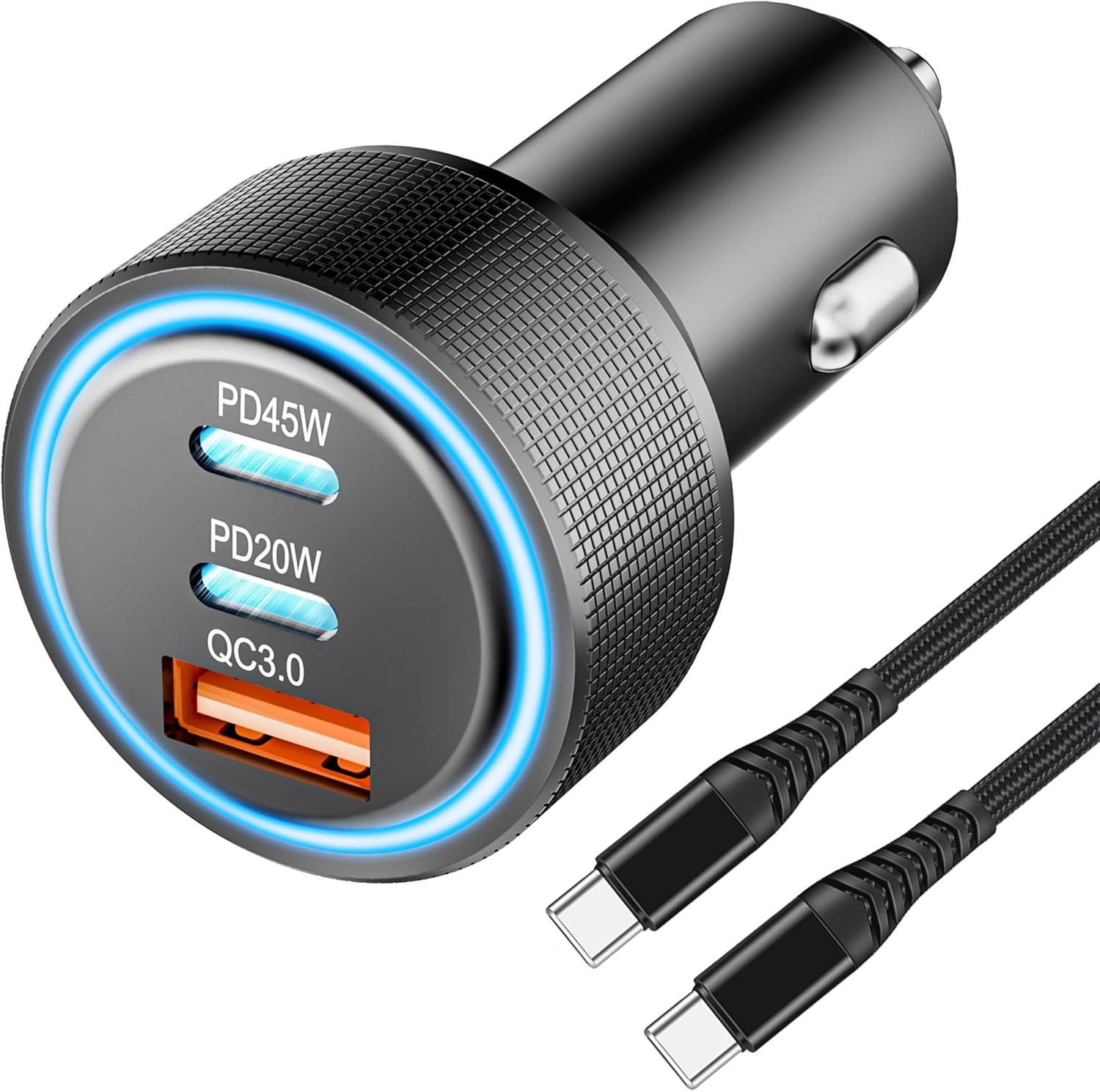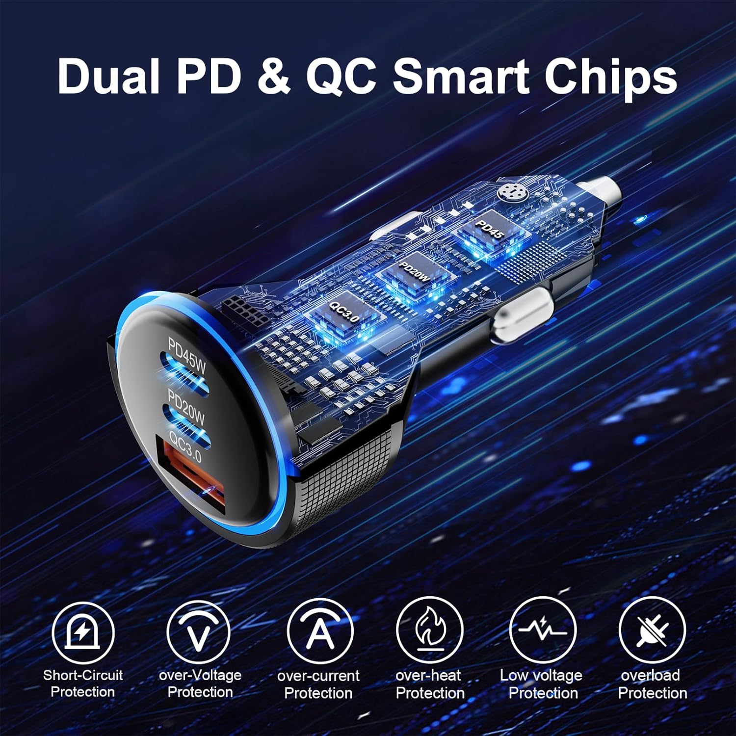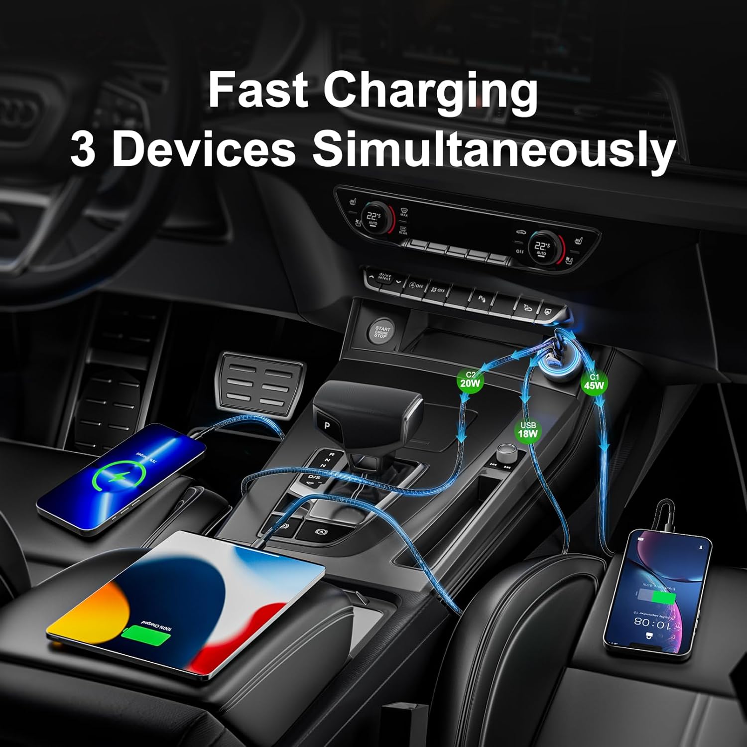 • Супер бързо зарядно за кола: USB C зарядното за кола за запалка е оборудвано с бързо зареждане PD 45 W, PPS PD 20 W и QC3.0 18 W порт за зареждане и може да зарежда 3 устройства едновременно. USB адаптерът за запалка гарантира, че устройството ви ще бъде заредено по време на пътуване или пътуване, независимо дали използвате карти или стриймвате музика. С този USB адаптер за кола можете да сте готови да се уверите, че батерията на автомобила ви няма да ви разочарова.