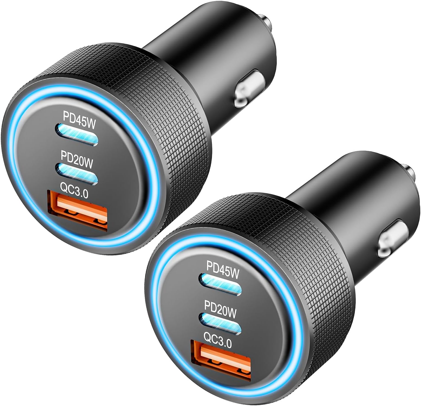 USB C зарядно за кола, 3-портово 65W двойно USB-C захранване за кола PD/QC3.0 бързо зареждане USB зарядно за запалка за iPhone 15/14/13 Pro Max, Samsung Galaxy S24/S23/S22 (черно - 2 броя)