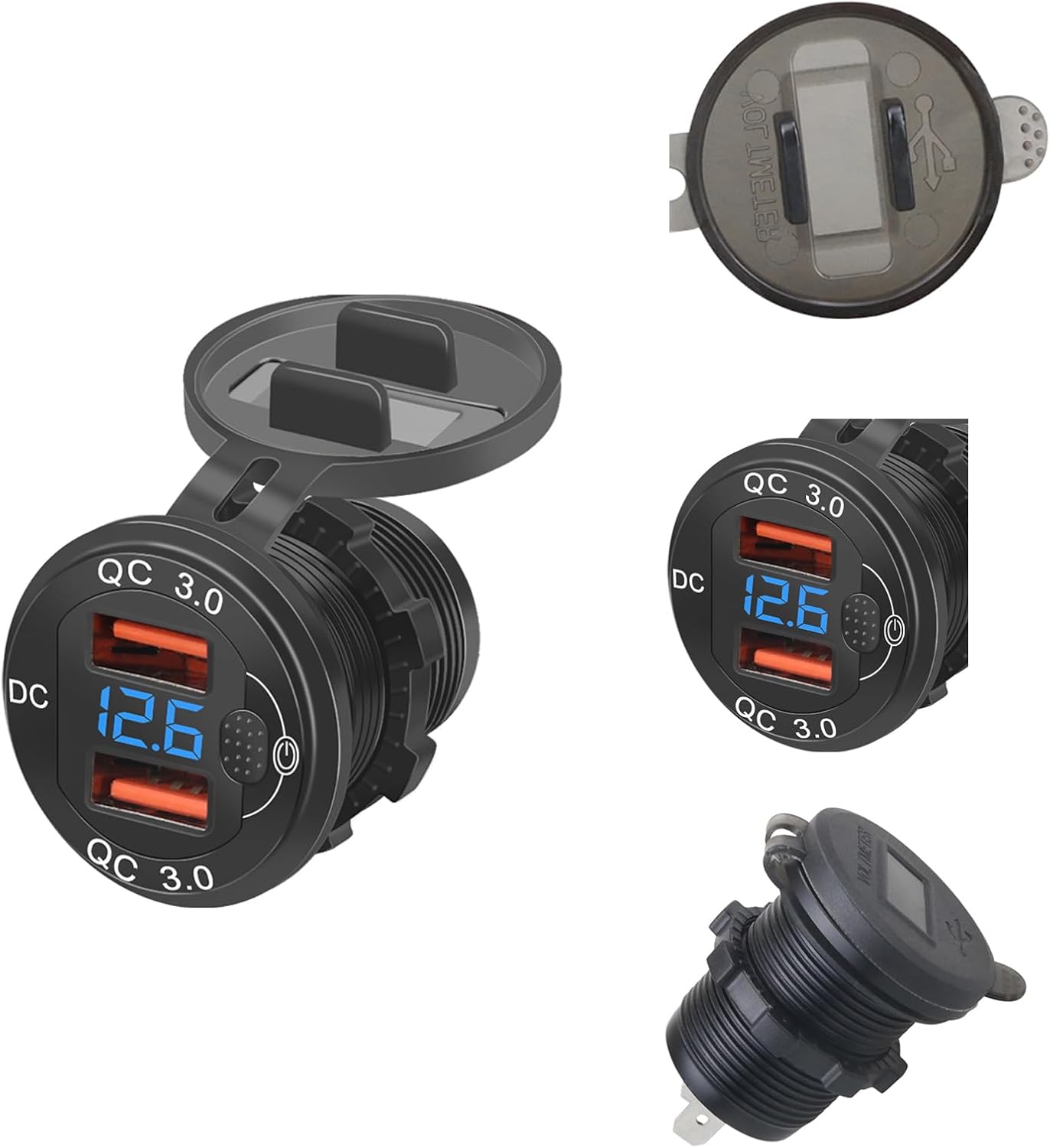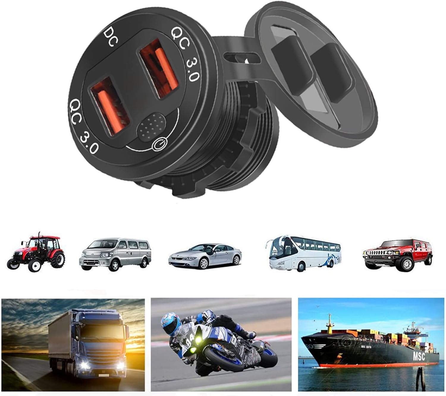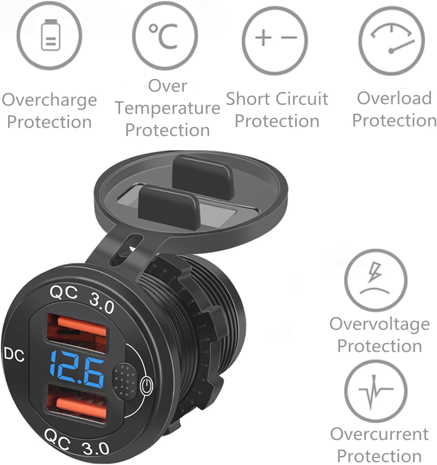 USB контакт за кола, контакт за зарядно за кола QC3.0, 12V/24V водоустойчив двоен USB контакт за зареждане на кола с 23,6-инчов кабел, LED дисплей и сензорен превключвател
