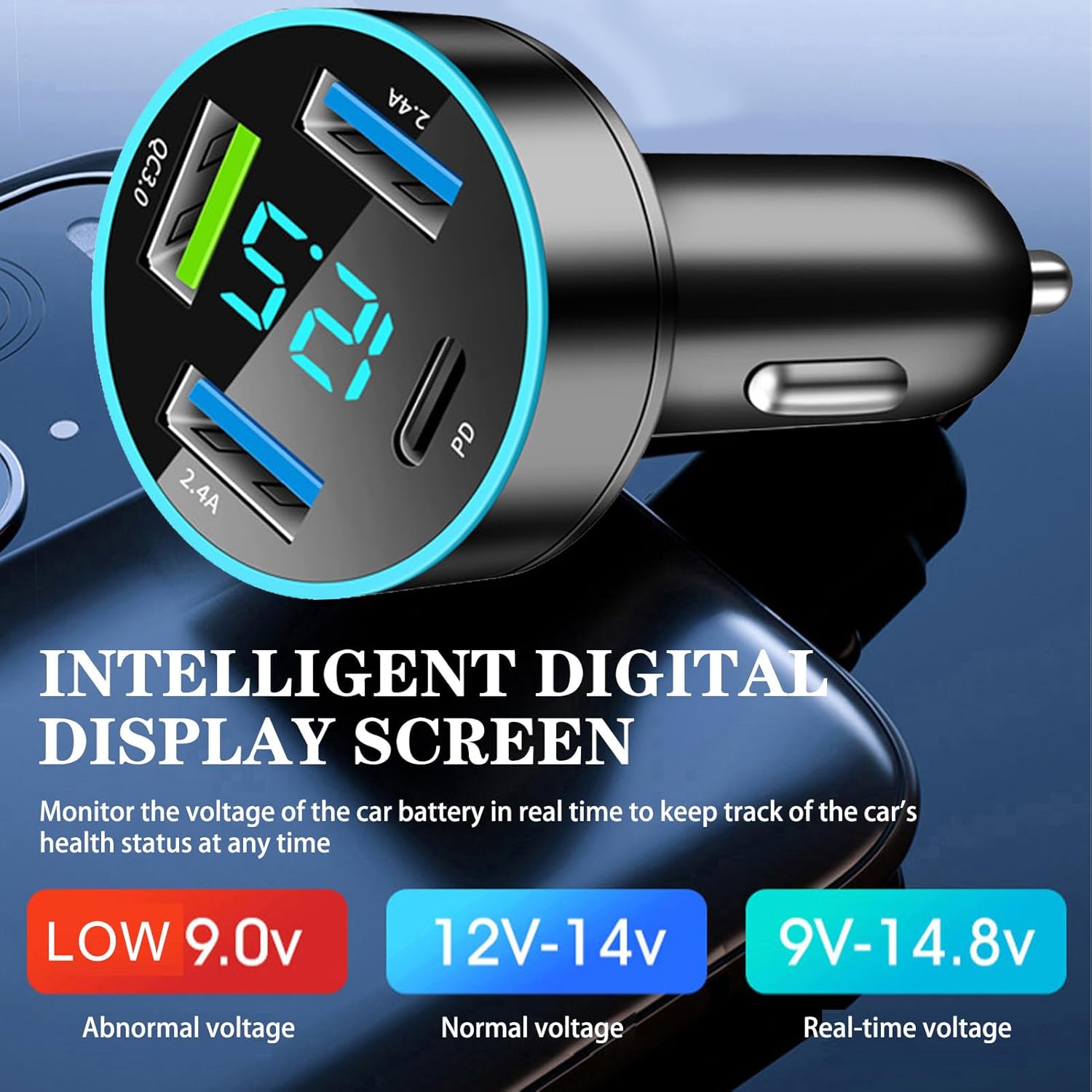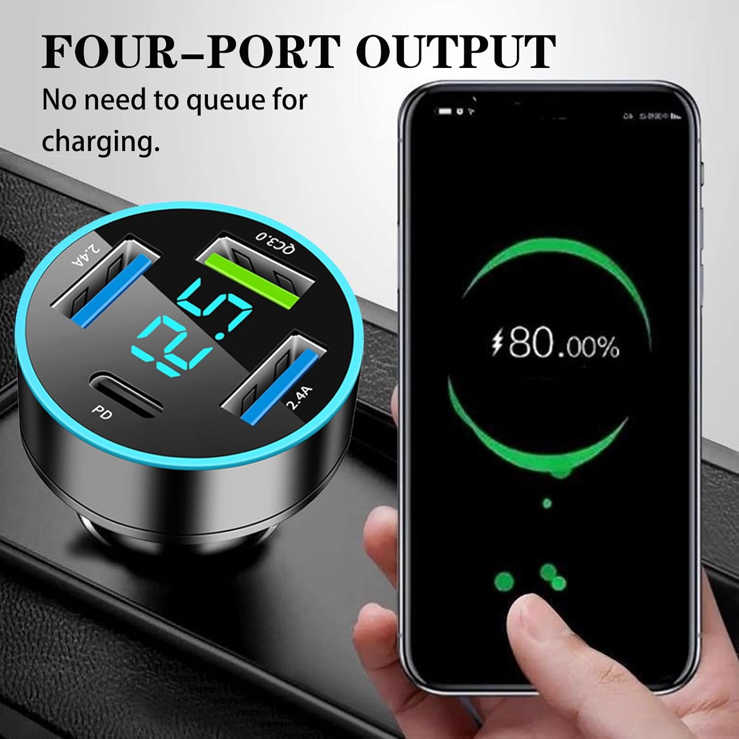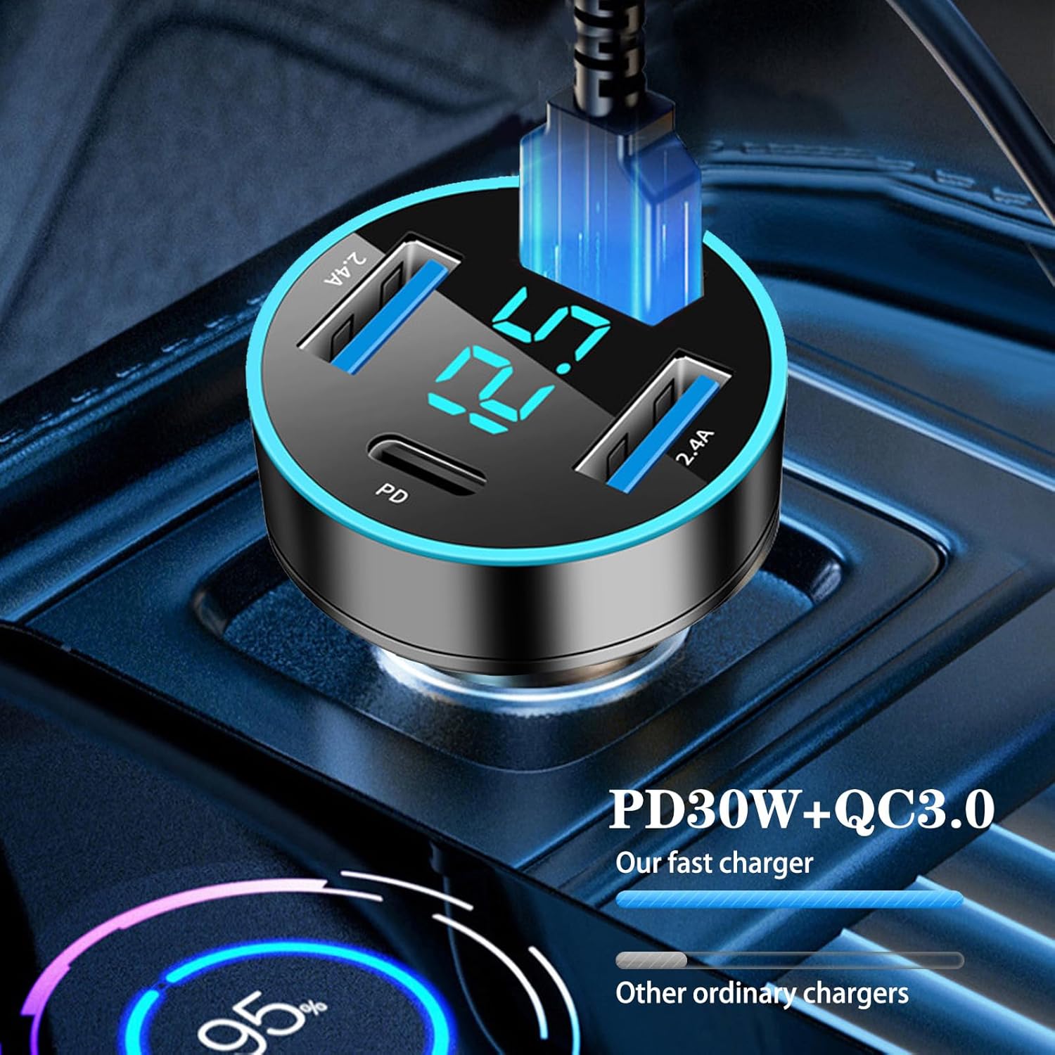 4-портово бързо зареждане: Нашият USB адаптер за запалка има четири порта за зареждане, включително QC3.0 [18W], PD [30W] и двоен 2.4A [12W]. USB гнездото за запалка поддържа технологията за бързо зареждане QC3.0 и PD, поддържа максимално входно напрежение от 12V до 24V, USB зарядното за кола може бързо да зарежда четири устройства едновременно. Зарядното за кола е идеално за зареждане у дома или при пътуване на дълги разстояния.