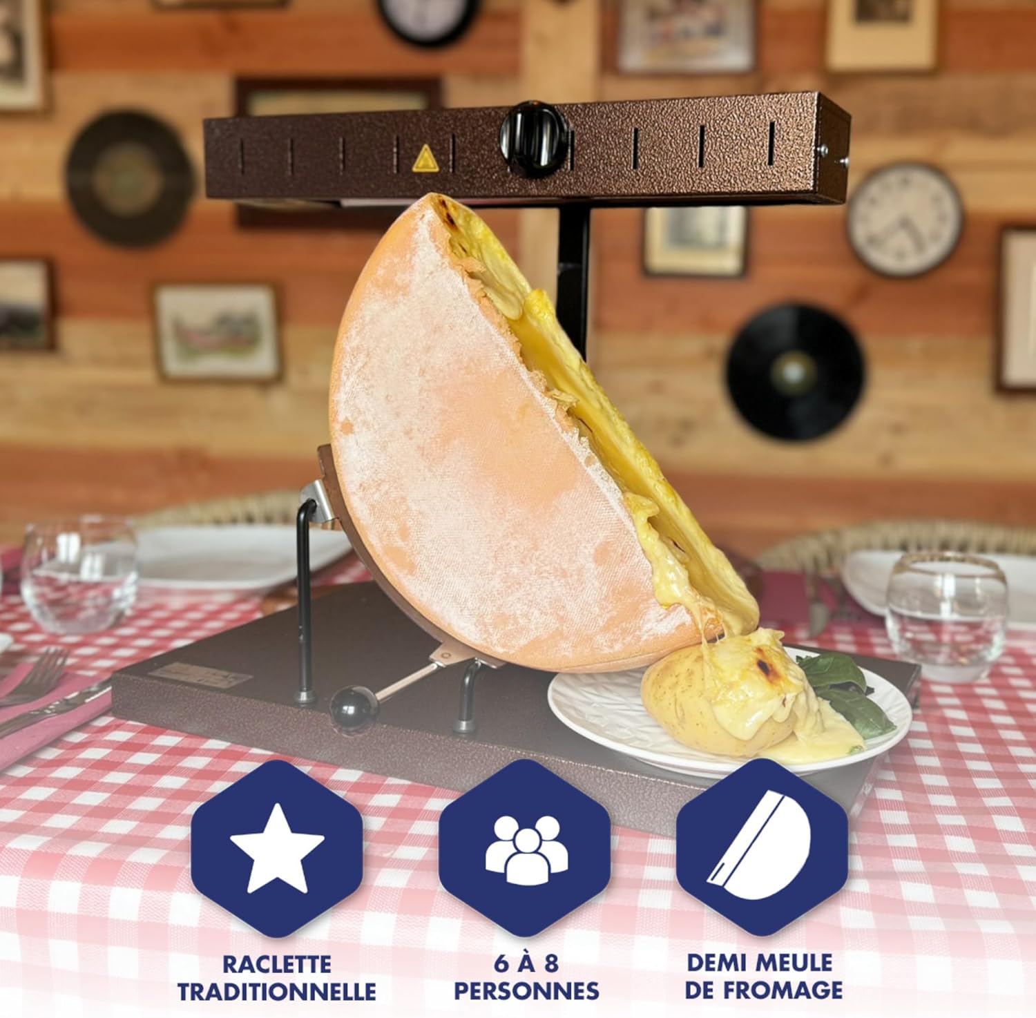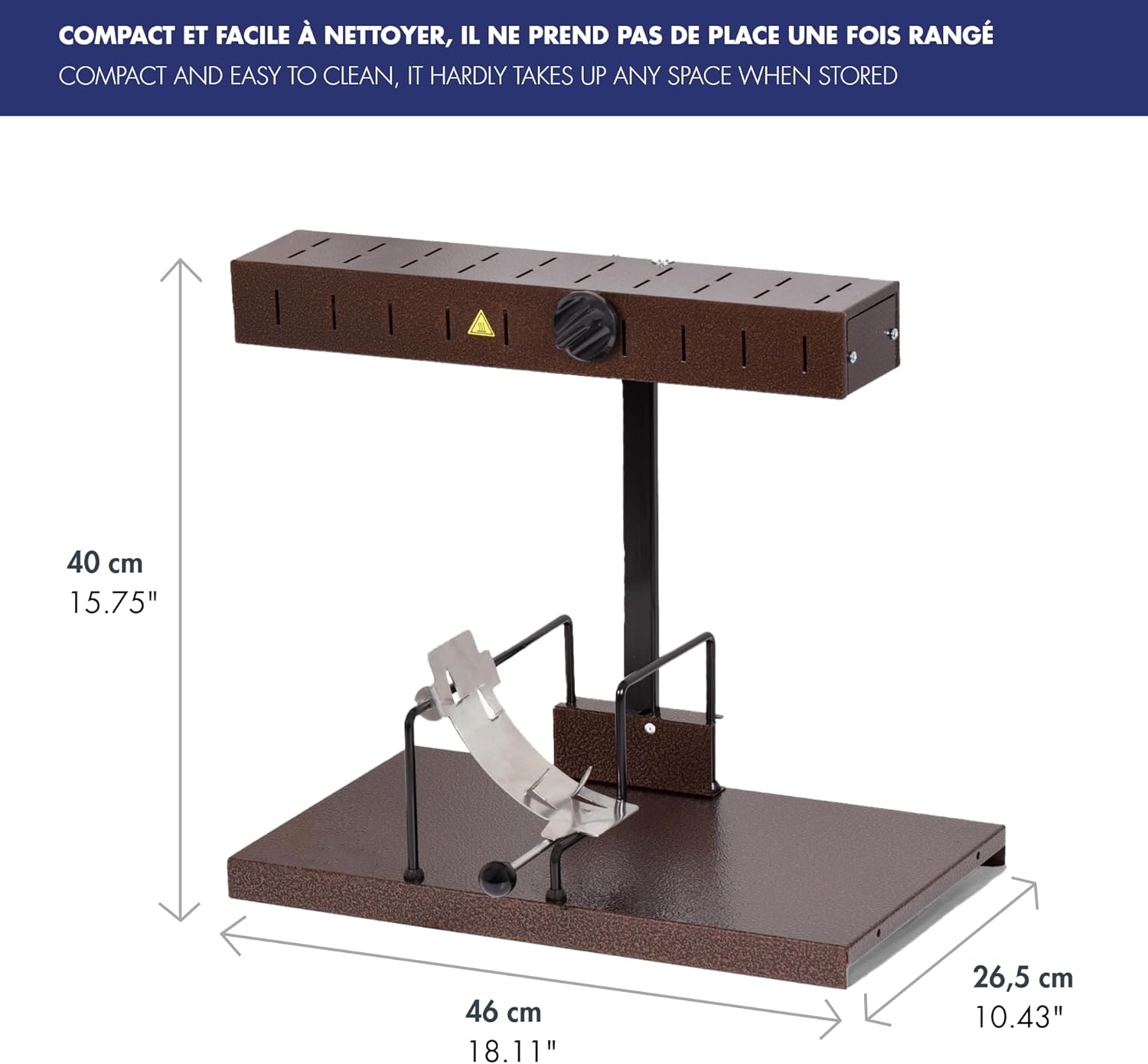 • ТРАДИЦИОННО УСТРОЙСТВО ЗА РАКЛЕТ: Тази машина за раклет окачва порция хляб и се нагрява непрекъснато, за да можете да сервирате при нужда. С мощност 230 V, тя е подходяща за маса с 6 до 8 гости.