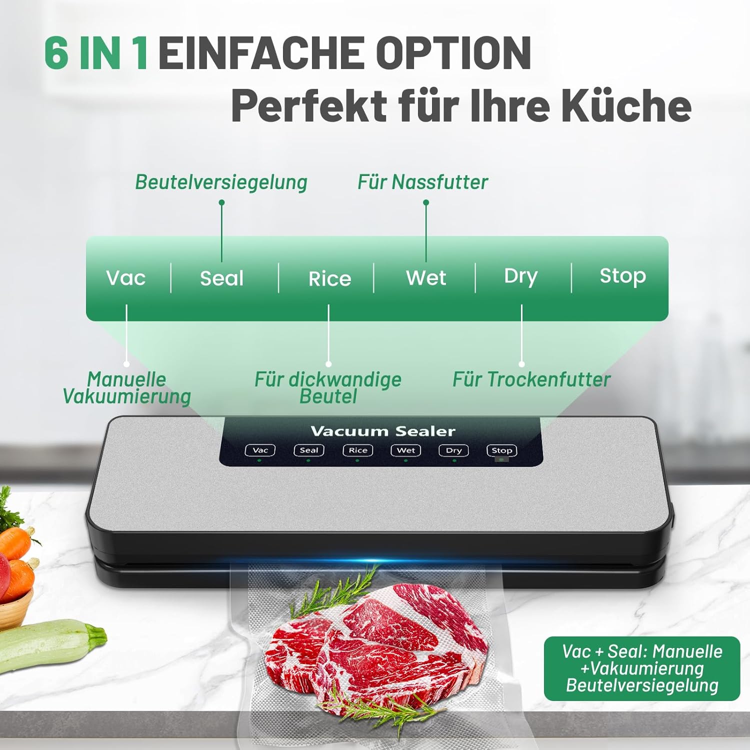 • ИНТЕЛИГЕНТЕН СЕНЗОРЕН ЕКРАН И ШЕСТ РЕЖИМА НА РАБОТА Подобрената вакуумна запечатваща машина Raycia 6 в 1. Бутон Vac - Ръчно контролира нивото на вакуум (заедно с бутона за запечатване); Бутон Seal - за запечатване; Бутон Rice - идеален за вакуумно запечатване на дебели опаковки; Бутон Wet - подходящ за вакуумно запечатване на мокри храни; Бутон Dry - идеален за сухи храни; Бутон Stop - спира работата.