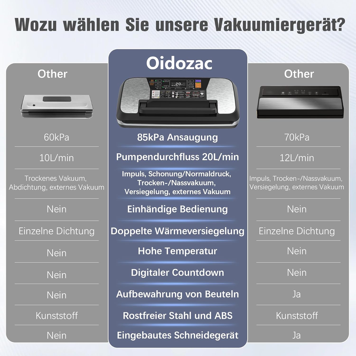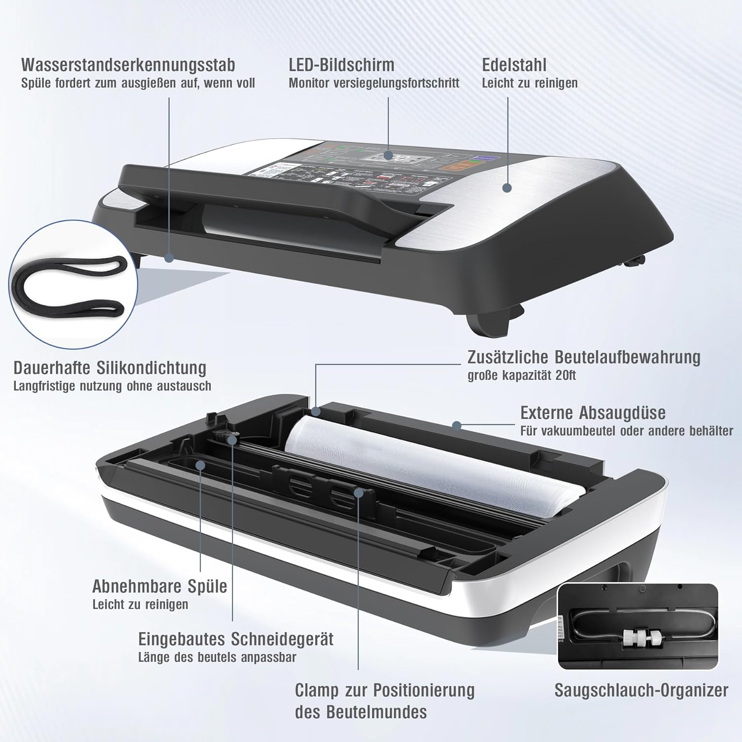• Отлична технология за запечатване: благодарение на двойното термично запечатване и висококачественото силиконово уплътнение, нашият вакуумен уред удължава срока на годност на храната ви с 10 пъти. Идеален за приготвяне на храна, остатъци от храна и пресни продукти от хладилника - без изгаряне във фризера или хранителни отпадъци.