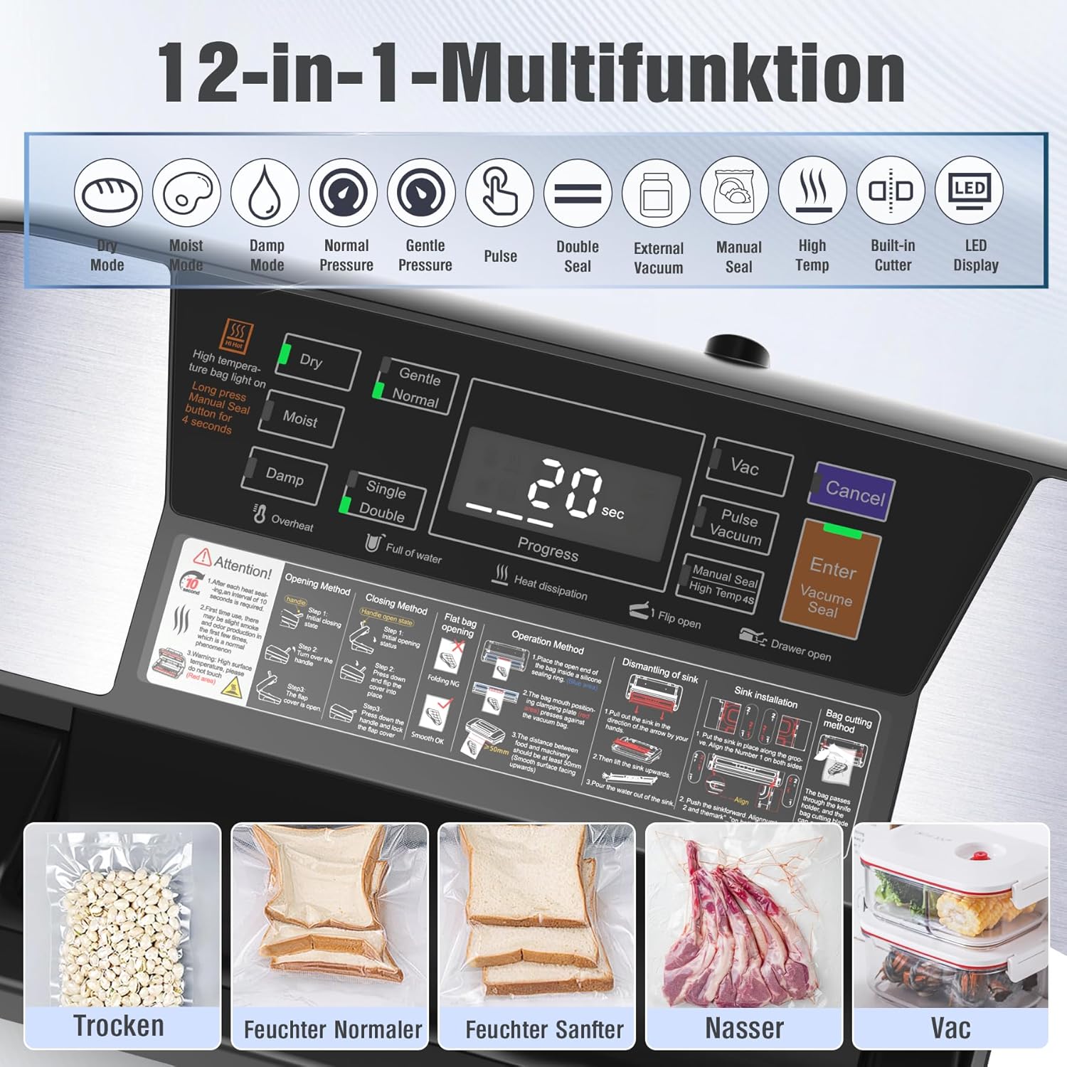 • 12 в 1 функции: Този обновен вакуумен уред има сух, мокър и мокър режим, нормални и нежни настройки за вакуумно налягане в зависимост от вида храна за максимална свежест, както и импулсен режим за ръчно управление. Предлагат се също 10 различни размера торбички за вакуумно запечатване, 1 ролка фолио за вакуумно запечатване и връзки за вакуумен маркуч.