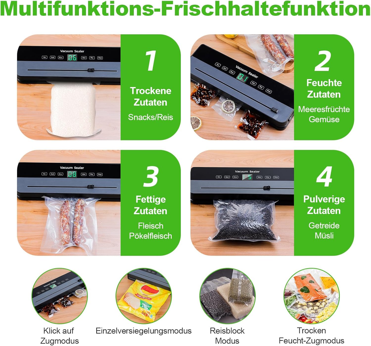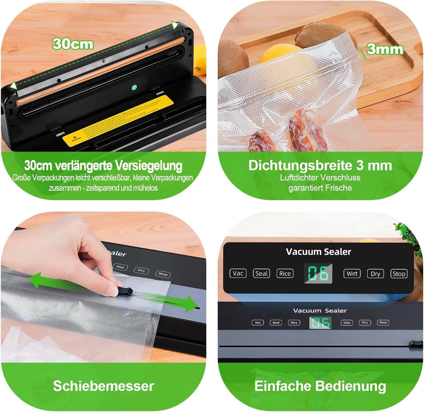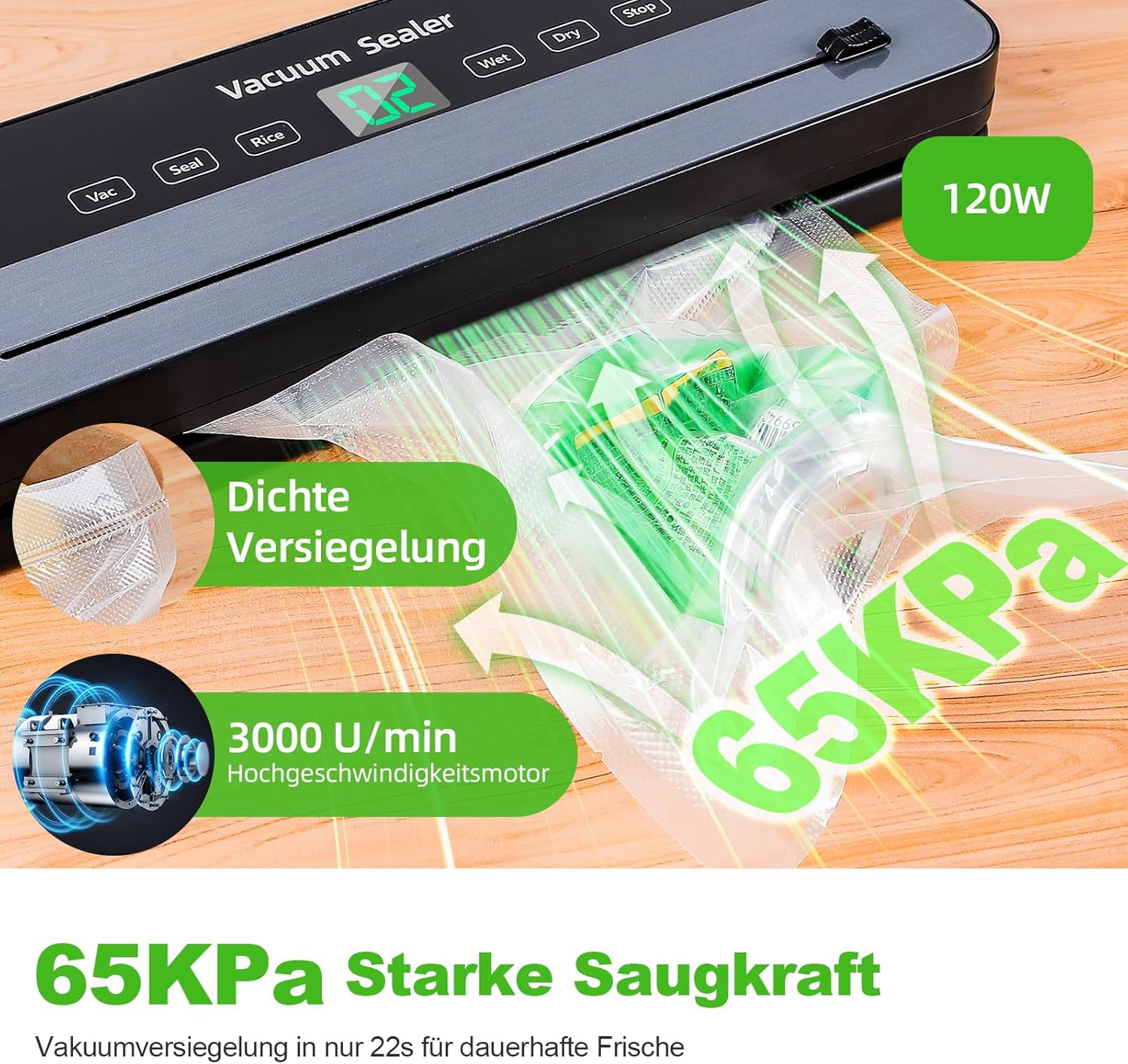 • 65kPa силен вакуум за плътно запечатване: Оборудван с високоскоростен мотор с 3000 об/мин, този вакууматор осигурява всмукателна мощност от 65kPa, осигурявайки плътно опаковане. Ширината на запечатване от 3 мм запазва храната свежа в кухни, ресторанти или у дома.