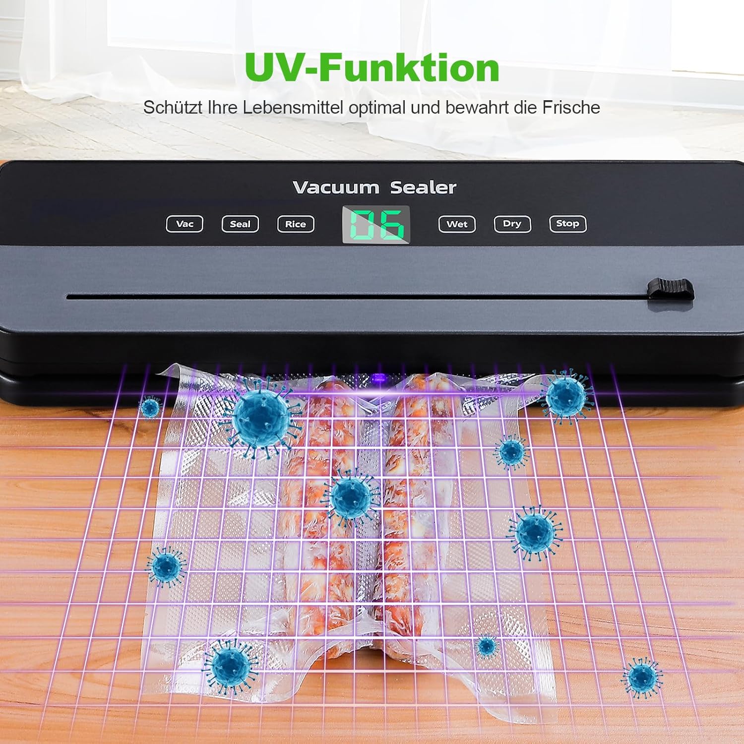 • 7 В 1 УНИВЕРСАЛНОСТ ЗА ВСИЧКИ ВИДОВЕ ХРАНА С режимите "Сухо", "Мокро", "Ориз", "Вакуум", "Запечатване", "Рязане" и "UV", този вакуумен уред се адаптира към вашите нужди. Вграденият нож и опциите за ръчно запечатване правят устройството идеално за запечатване на месо, плодове, зеленчуци и други.