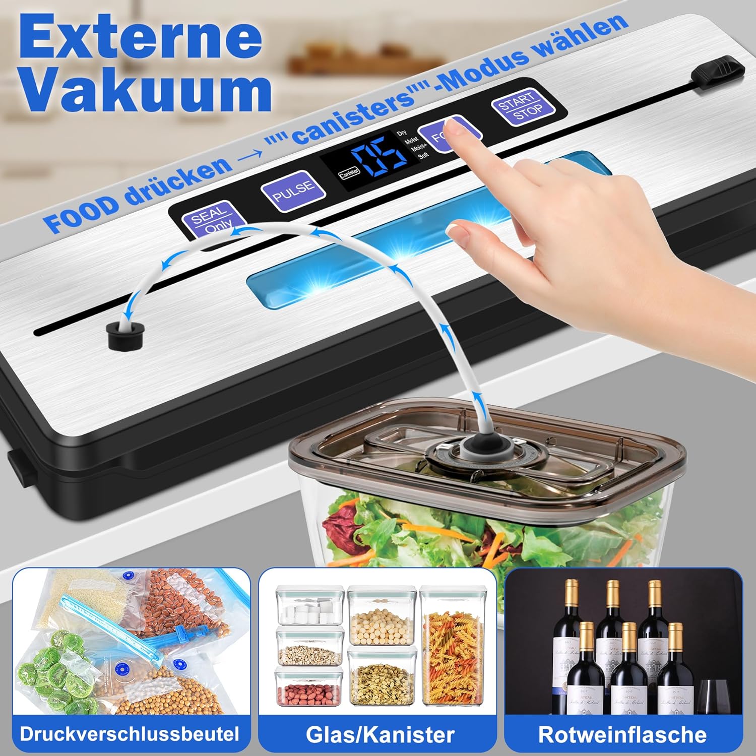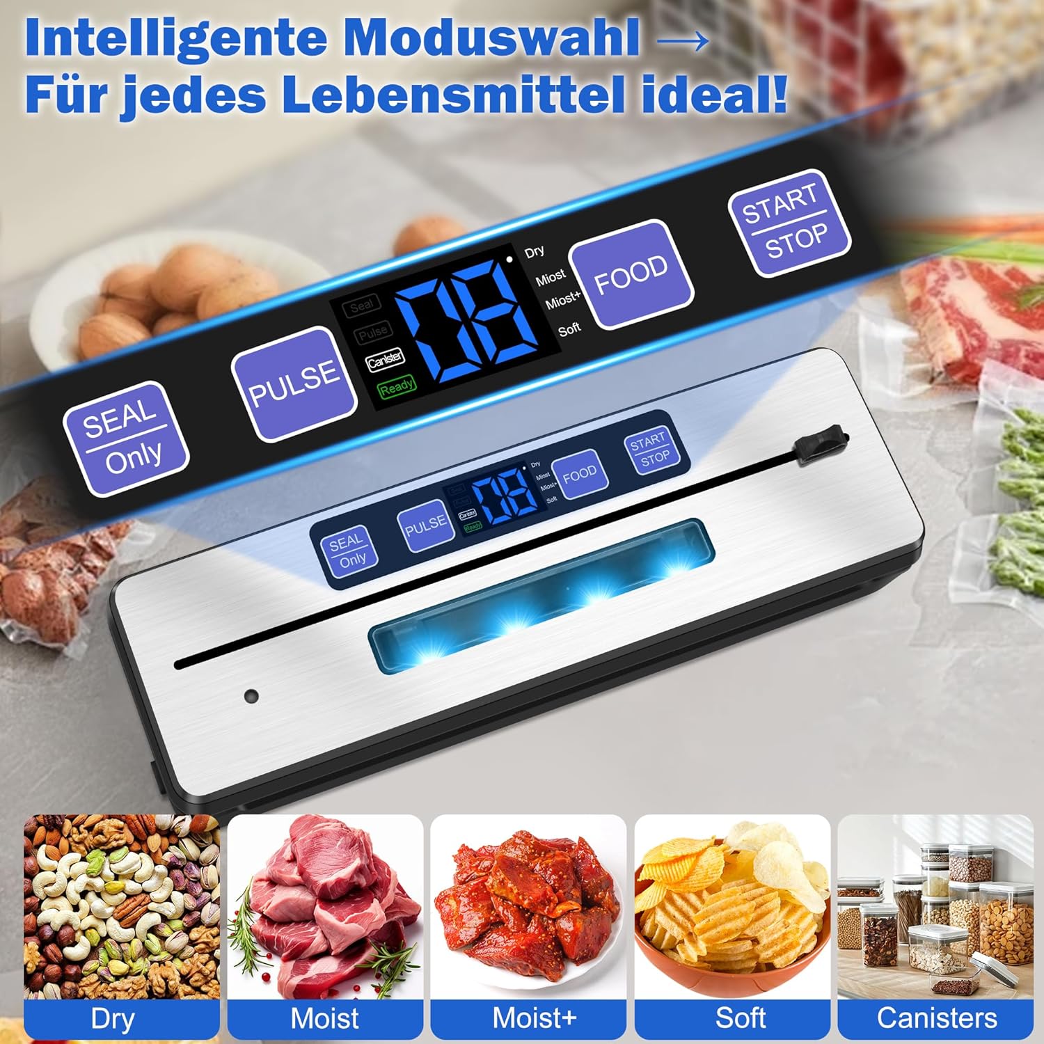 • 7-в-1 функции: Dry/Moist/Moist+/Soft: режим в зависимост от вида храна; PULSE: ръчно вакуумно запечатване с автоматично запечатване; SEAL Only: бързо освобождаване без вакуум; Canister: вакуумно запечатване с външен контейнер за маринована храна