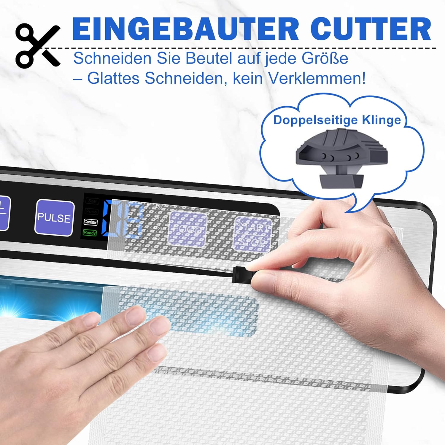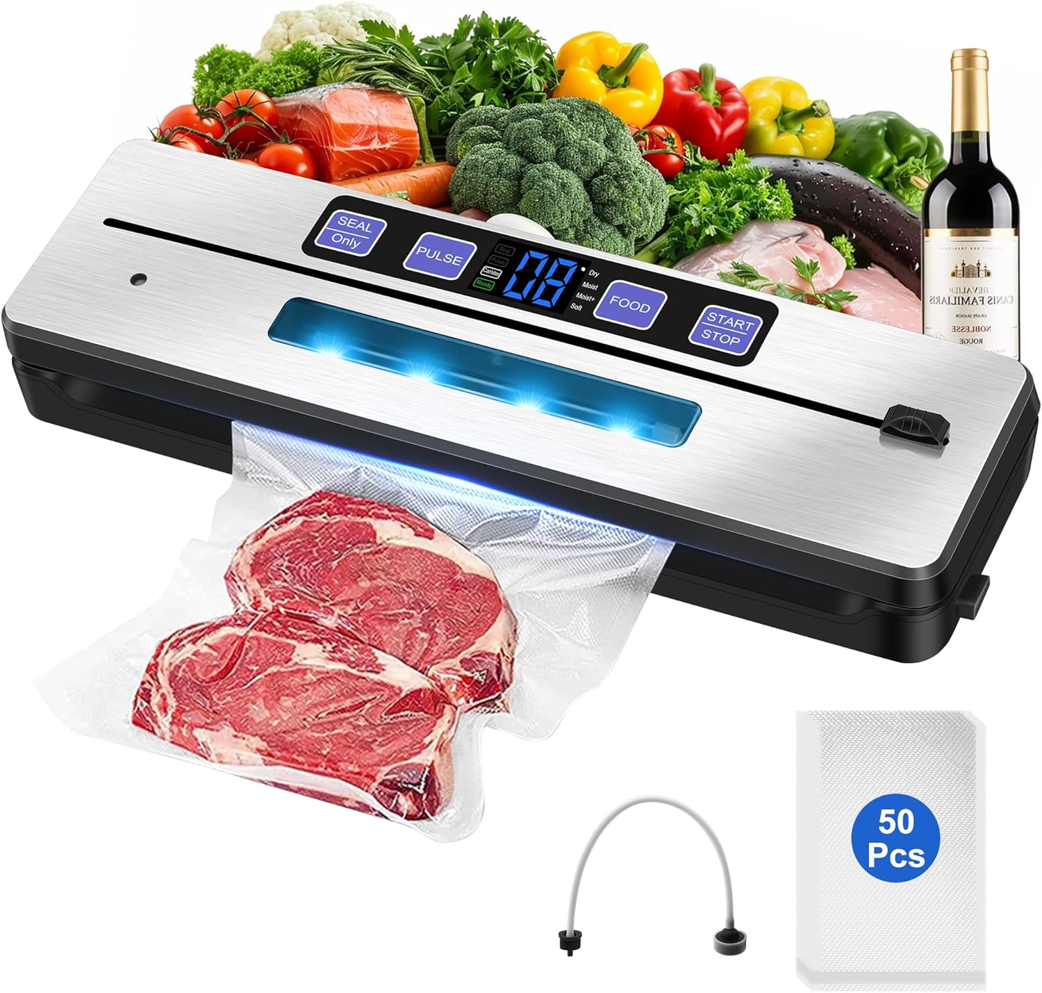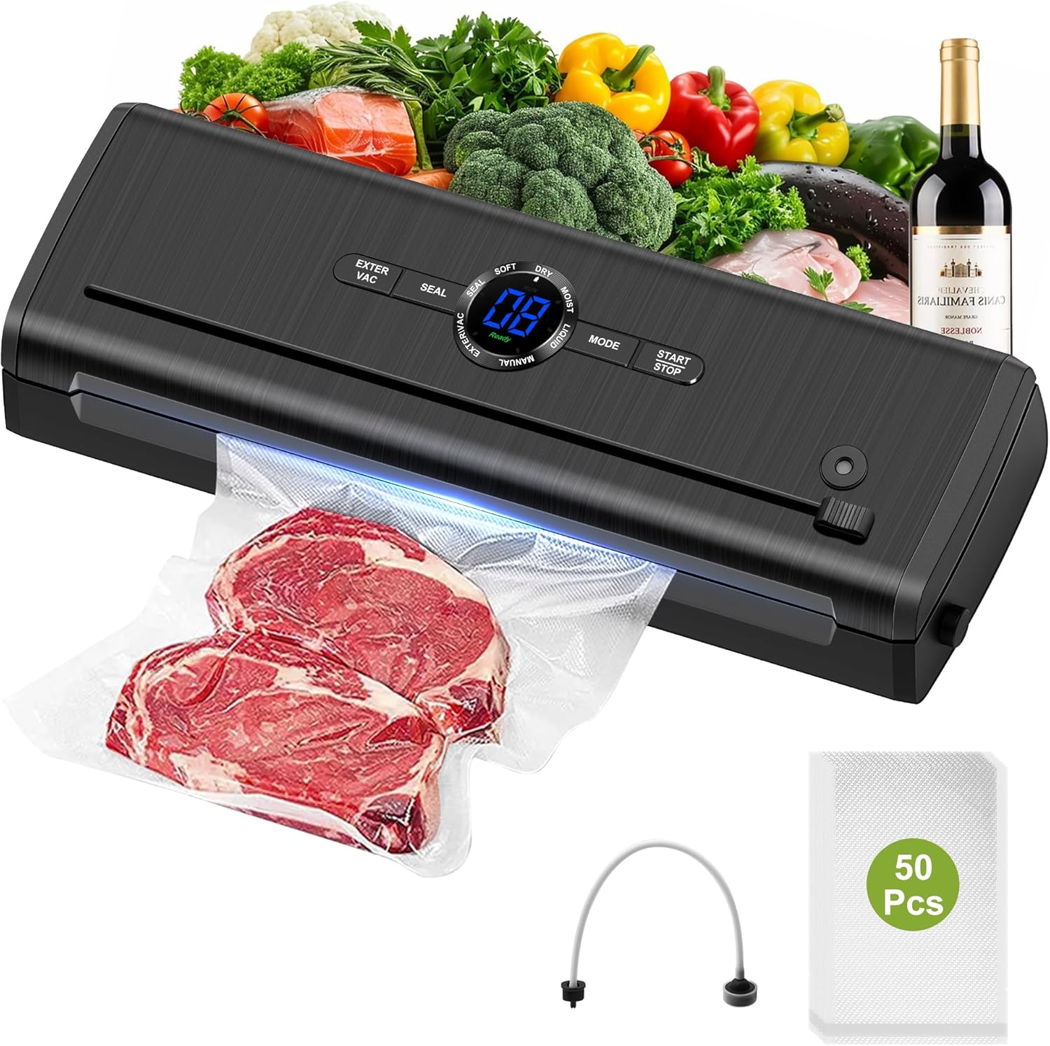 • ИНТЕЛИГЕНТЕН ДИЗАЙН Простият потребителски интерфейс изисква само едно докосване за бързо засмукване на въздух и запечатване на различни видове храни. LED дигитален дисплей - Осигурява обратна връзка в реално време за напредъка на запечатването.