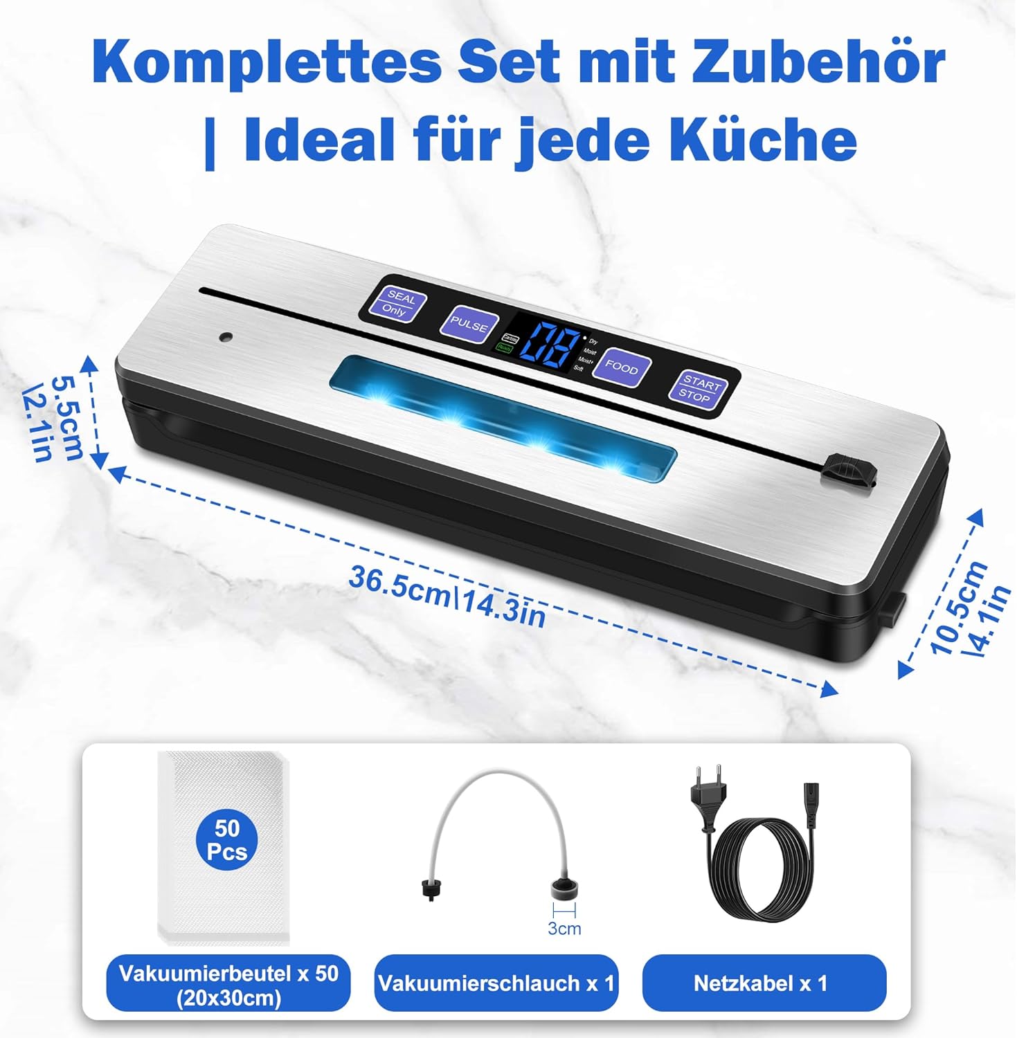 • Пълен комплект за прахосмукачка: 1 x машина за вакуумно запечатване, 50 x торби за вакуумиране (20 x 30 см), 1 x външен маркуч за засмукване на въздух, 1 x кабел за зареждане, 1 x ръководство за потребителя (английски език не е гарантиран)