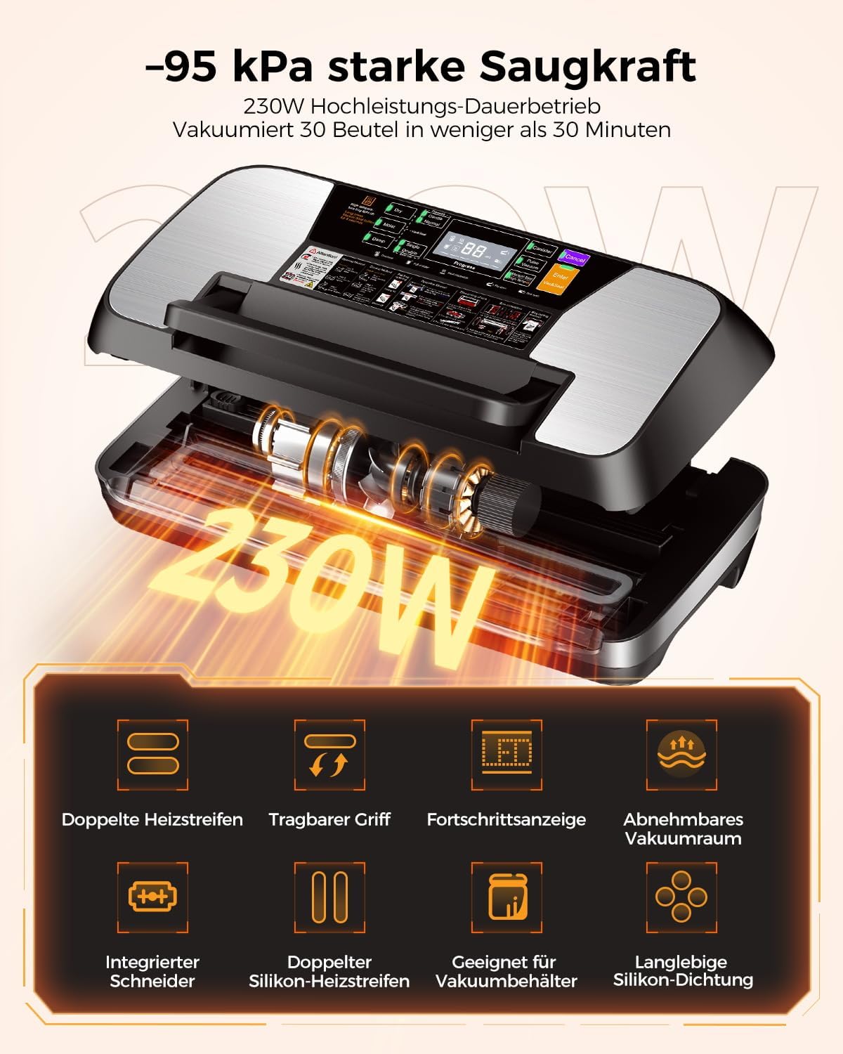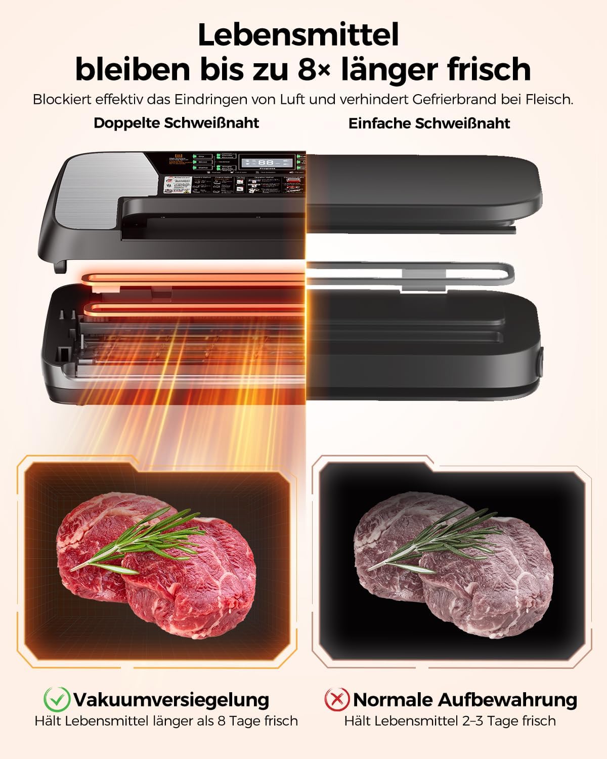 • Двойно заваряване: максимална производителност благодарение на двойното термично заваряване с дебелина 2,5 мм всяко, за да запази храната ви свежа до 8 пъти по-дълго. Само с натискане на бутон на автоматичния бутон, този вакууматор за храна автоматично извършва целия процес от вакуумиране до запечатване. С вакуумен маркуч можете да го използвате за вакуумиране на вино, чаша и др. Многофункционалният вакууматор е лесен за употреба, дори за начинаещи.