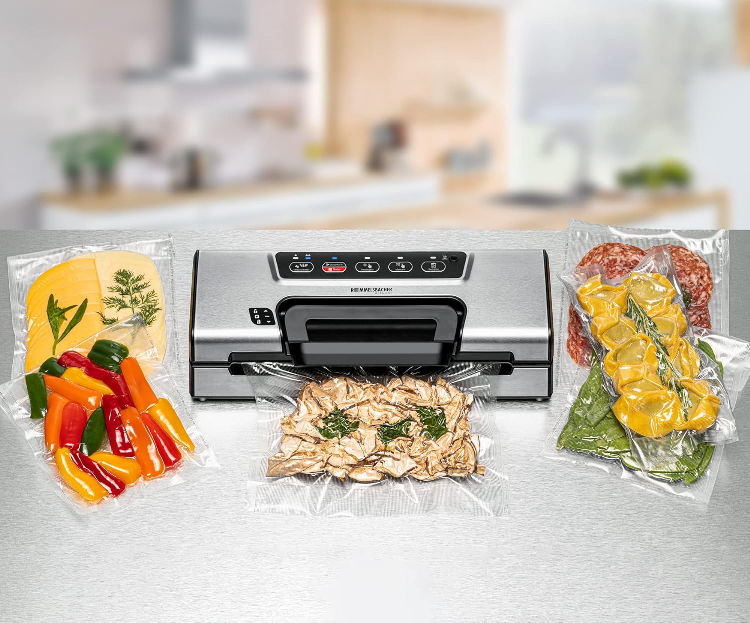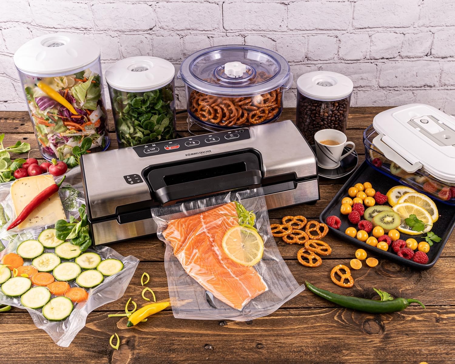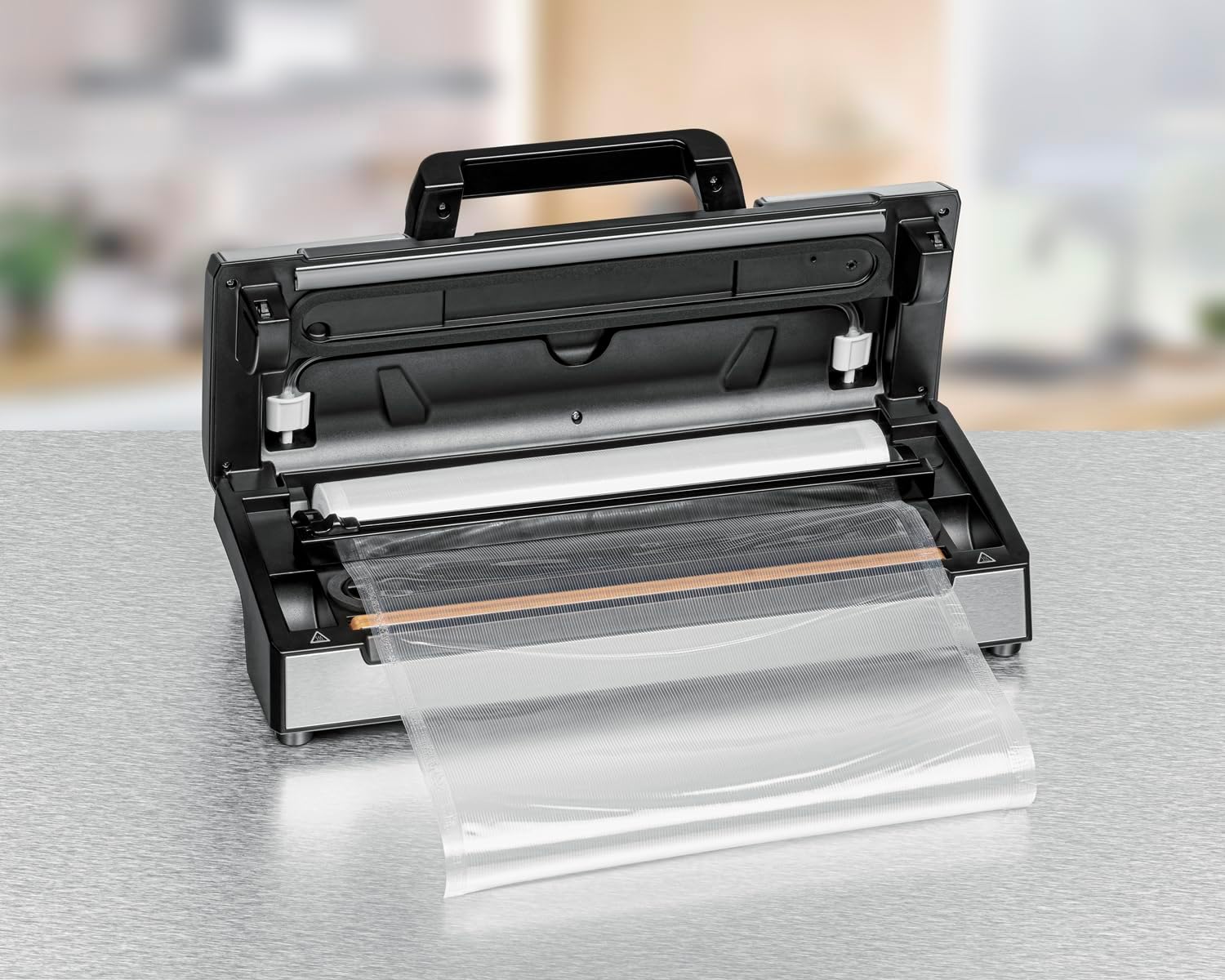 Този мощен вакуумен уред впечатлява и професионалистите. С удобната си дръжка, устройството може лесно да се отваря и затваря без усилие. Независимо дали е за частно домакинство, рибари, ловци или полупрофесионална употреба в малка астрономия - устройството е гъвкаво. Вакуумният уред е подходящ за дългосрочна употреба. B. Големи покупки могат да се обработват без прекъсвания, а реколтата от градината може да се опакова бързо. Интегрираното отделение за ролка фолио с режещо устройство поддържа необходимото специално фолио готово. Мощната помпа абсорбира до 97% от въздуха от специалните вакуумни торбички и след това ги запечатва напълно автоматично със здрав двоен шев само с един процес. С регулируемото време за запечатване и скорост на изпомпване, вакуумният процес може да се адаптира индивидуално към храната, която ще се обработва. За особено чувствителни на натиск храни е налична функция за ръчно засмукване и запечатване. Осветеният прозорец за наблюдение е особено практичен, така че можете да проверите правилното позициониране на торбичката в устройството. С функцията "вакуумен контейнер" дори чувствителни и течни храни могат да се вакуумират в специални вакуумни съдове и да се съхраняват свежи за дълго време. Вакуумирането увеличава срока на годност на храната от 3 до 5 пъти - така че този практичен уред не бива да липсва в никое домакинство. Нашият съвет: Можете да използвате устройството и за приготвяне на храна за готвене Sous Vide, тенденцията от звездната кухня.
