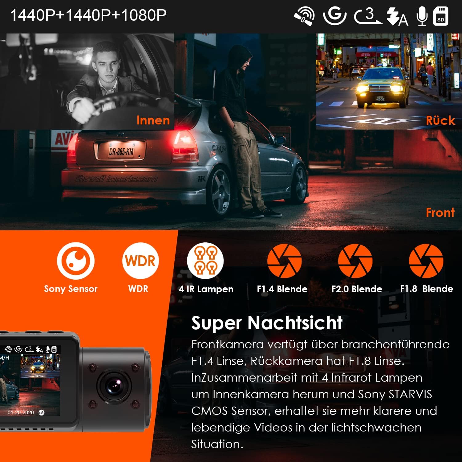 • 3 STARVIS 2 HDR Platepix НОЩНО ВИДЕНИЕ: Чувствайте се спокойни и сигурни като пътник през нощта с безжичната видеорегистратор! Оборудвана със сложния сензор STARVIS 2 IMX675, HDR и 4 IR светодиода, тя осигурява кристално ясни записи дори при слаба светлина – заснемайки както регистрационните номера пред вас, така и събитията вътре в автомобила ярко и ясно. VANTRUE N4S Видеорегистратор (отпред, отвътре, отзад): Силно препоръчителна задължителна камера за компании за споделено пътуване (Lyft) и таксиметрови компании!