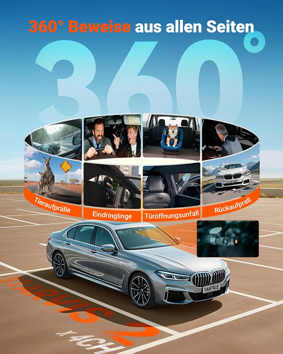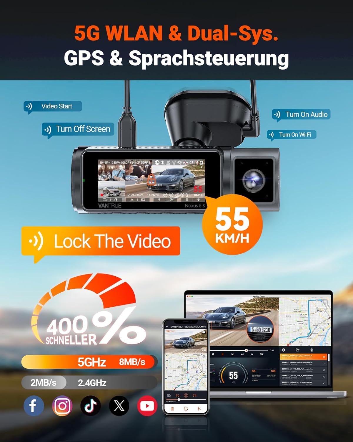 • SPRACHSTEUERUNG/ PRIVATSPHÄRE AUFNAHME/ G SENSOR -- Praktische Spracherkennung (auf Englisch) habe die Hände bei der Bedienung der Dashcam frei, mehr FlEXIBLER. Privatsphäre Modus speichert stets nur die letzten 3 Videos, erfüllt lokale Datenschutzgesetze, Loop-Aufnahme auch verfügbar, VANTRUE N5S Dashcam speichert bis zu 1 TB, VANTRUE 512 microSD-Karte (B09SP5YYZF) sowie andere VANTRUE-Speicherkarten wird empfohlen. G-Sensor sperrt bei Erschütterungen Videos, um Überschreiben zu vermeiden.