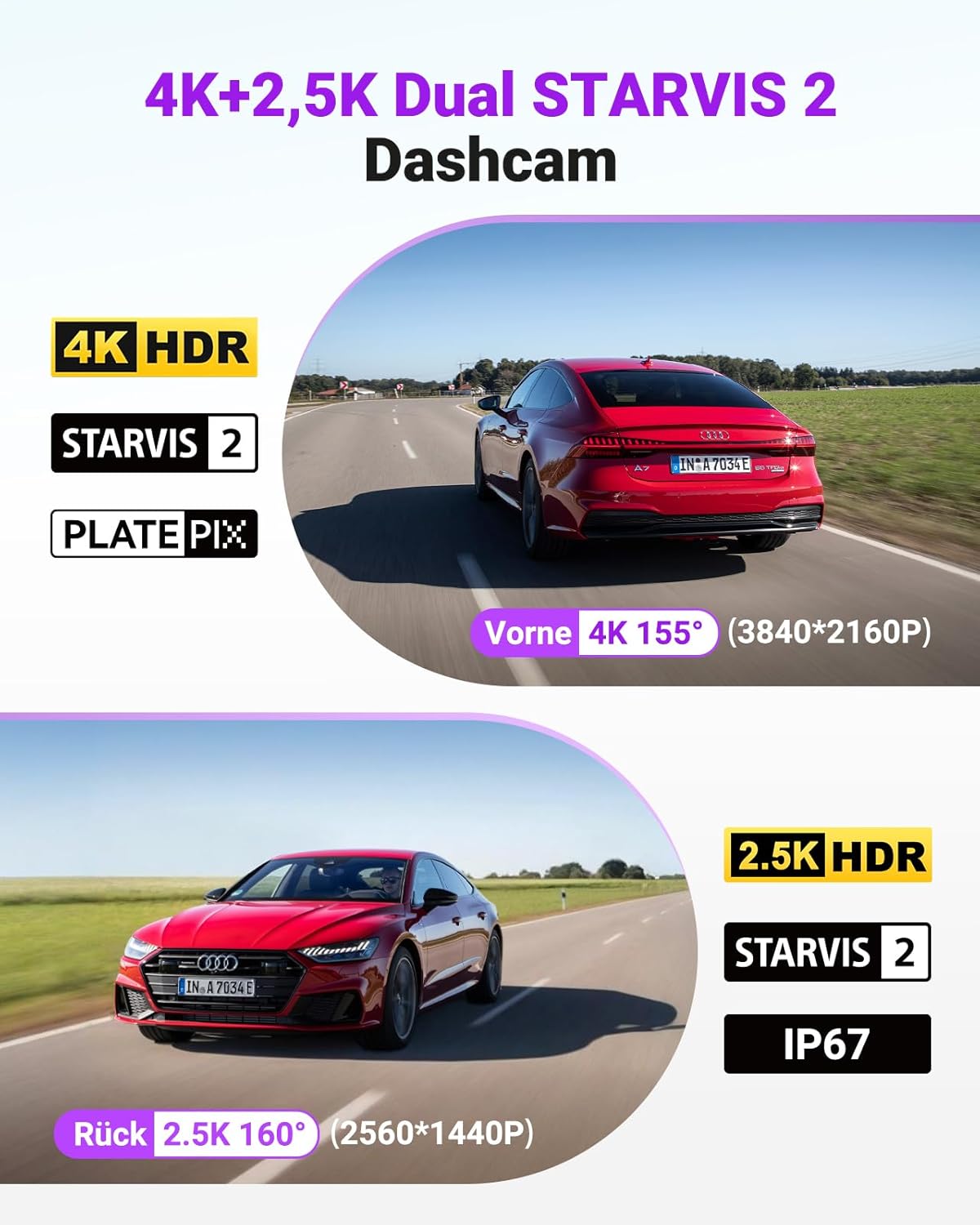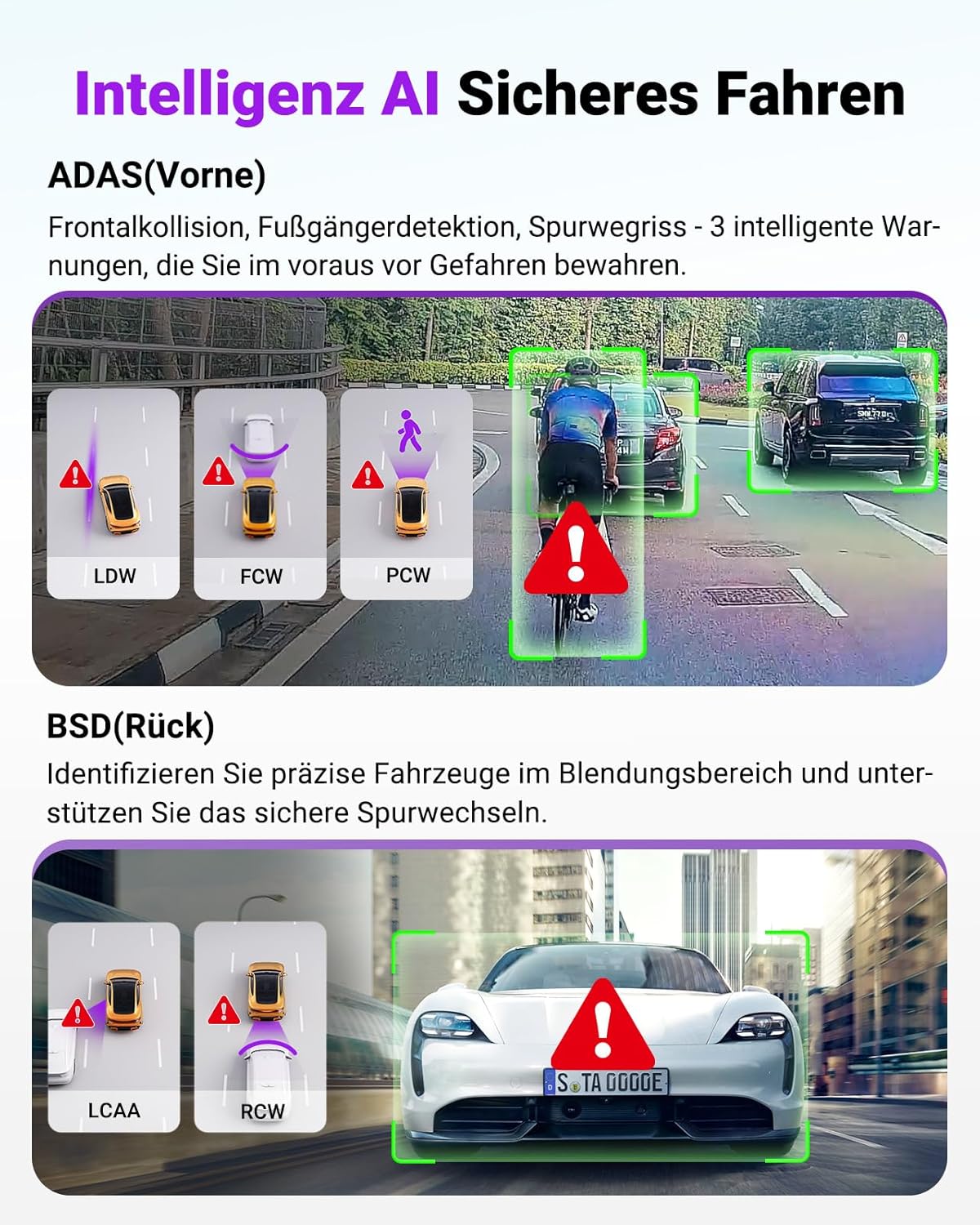 • AI Dual Radar + 4K IP67 КАМЕРА ЗА ЗАДНО ВИЖДАНЕ - Първата безжична интелигентна видеорегистратор с изкуствен интелект: Предният ADAS предупреждава за напускане на лентата и сблъсъци отзад за 0,5 секунди (70% намаление на риска), както и за пешеходци. Задният BSD сканира мъртвите зони при смяна на лентата в дъжд. Водоустойчивата задна камера IP67 издържа на силен дъжд, осигурявайки ясна видимост при типични немски метеорологични условия. Идеална за предотвратяване на инциденти в градски и магистрален трафик, тя е подходяща и за автомобили, кемпери и ванове, както и за голямо разнообразие от модели и начини на живот.
