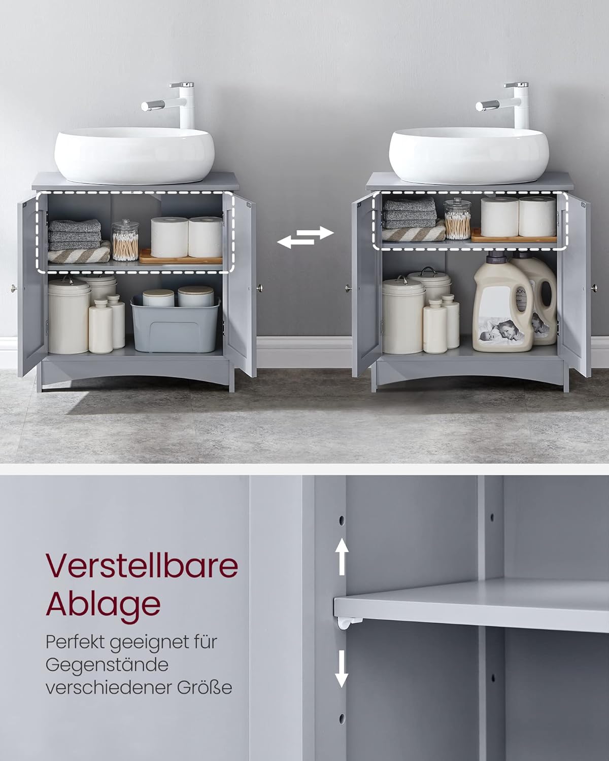 • Достатъчно място за всичко: Вътрешното пространство за съхранение е разделено на 2 отделения с регулируем на 3 нива рафт. Предмети с различни размери се побират добре в гардероба. Възползвайте се максимално от пространството в банята или под мивката.