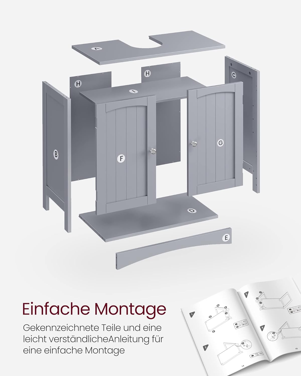 • Сглобяване за нула време: Следвайте подробните инструкции (английският език не е гарантиран) и сглобете този шкаф за мивка стъпка по стъпка. Отделните части са добре обозначени, за да не се объркате излишно.