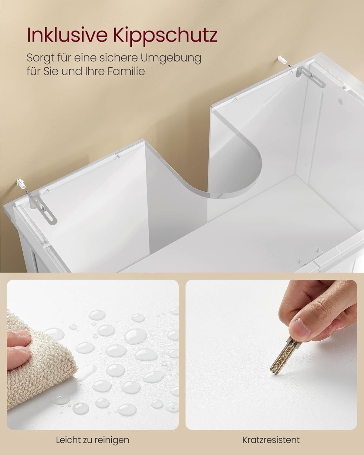 • Отворени или затворени? И двете. Вратите с хромирани метални дръжки могат да се отварят до 180°. Съхранявайте кърпи, почистващи препарати, тоалетна хартия и други прибори. Защитени сте от прах, вода и нежелани погледи.