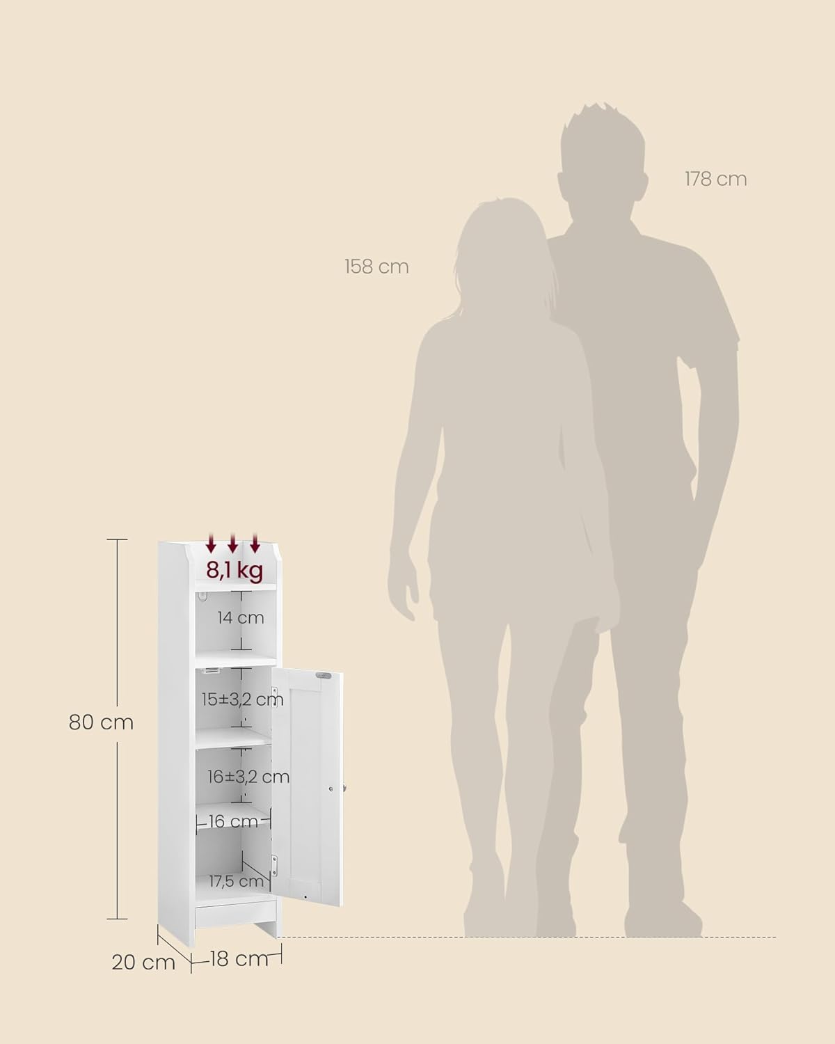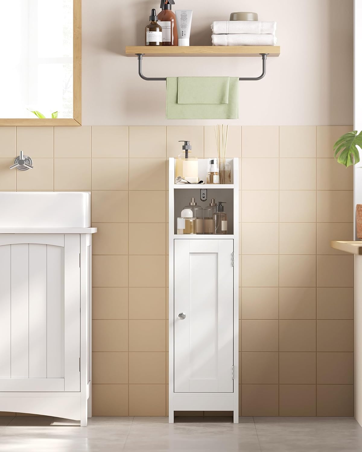 VASAGLE BBC310W01 Тоалетен шкаф, Шкаф за баня, Тесен рафт за баня, Регулируеми рафтове, Спестяващ място, Лесен монтаж, Бял