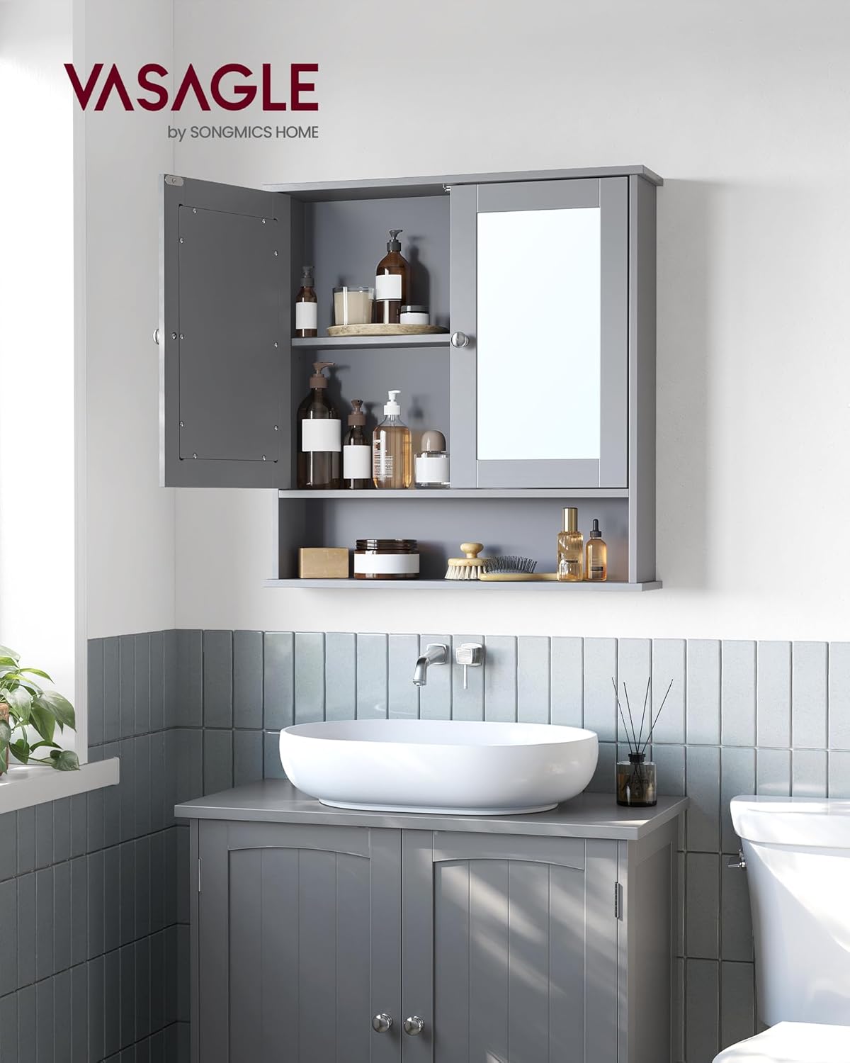 VASAGLE LHC002G02 Огледален шкаф, Шкаф за баня, Стенен шкаф с 2 огледални врати и отворено отделение, Регулируем рафт, За стенен монтаж, 13 x 56,5 x 58,5 см, Гълъбово сиво
