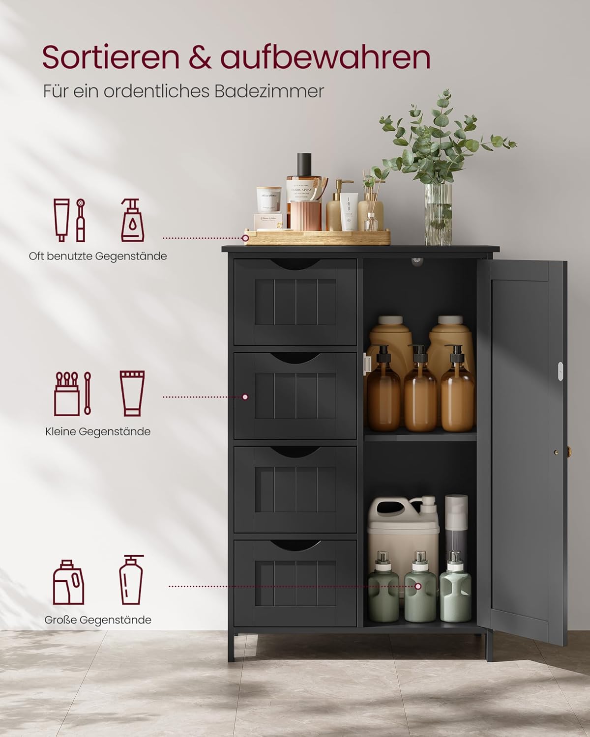 VASAGLE LHC041B02 Тесен шкаф за баня, страничен шкаф, скрин с 4 чекмеджета, регулируем рафт на вратата на шкафа, 30 x 55 x 82 см, мастилено черно