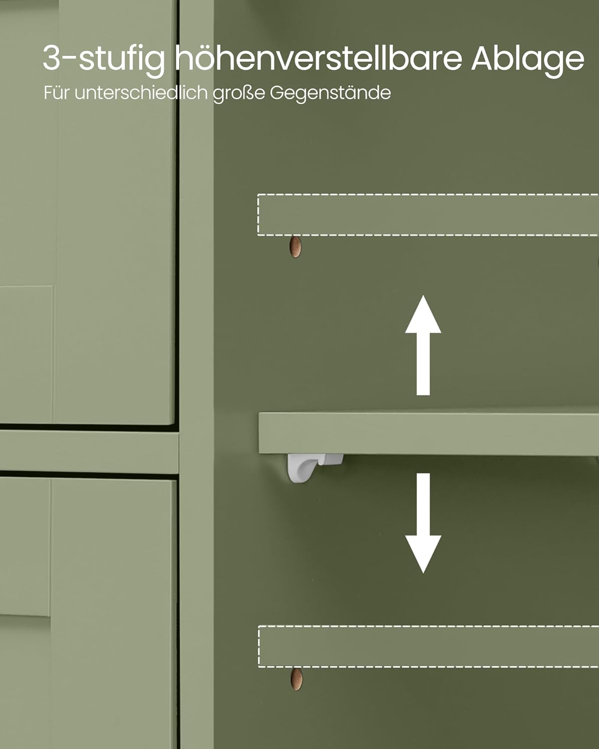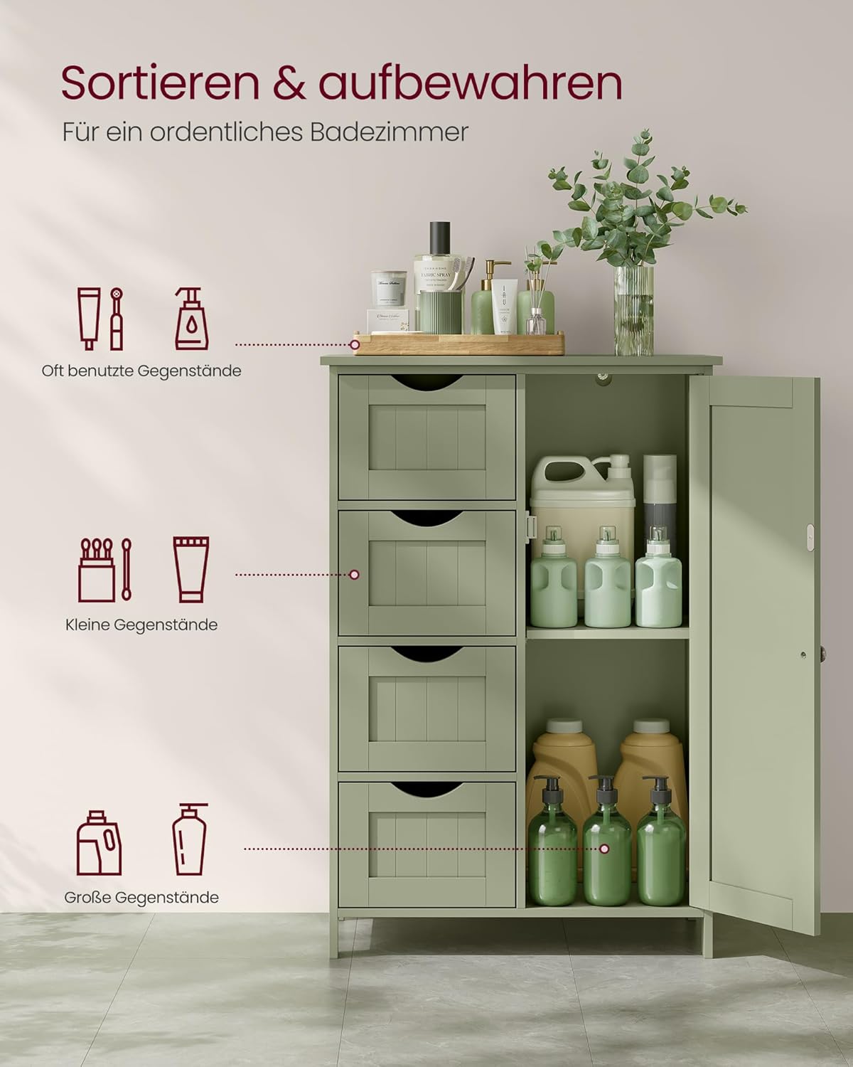 VASAGLE LHC041C02 Тесен шкаф за баня, страничен шкаф, скрин с 4 чекмеджета, врата, регулируем рафт, 30 x 55 x 82 см, лаврово зелено