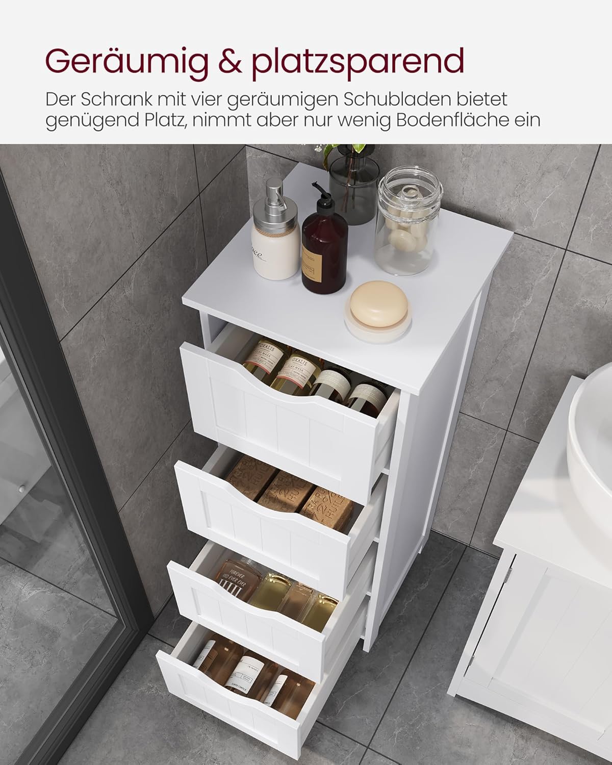 • Просторен и пестящ място: Този шкаф за баня с 4 чекмеджета осигурява много място за вашите вещи като кърпи, ролки тоалетна хартия, парфюм и други. С размери 30 x 30 x 82 см, този шкаф заема малко място на пода.