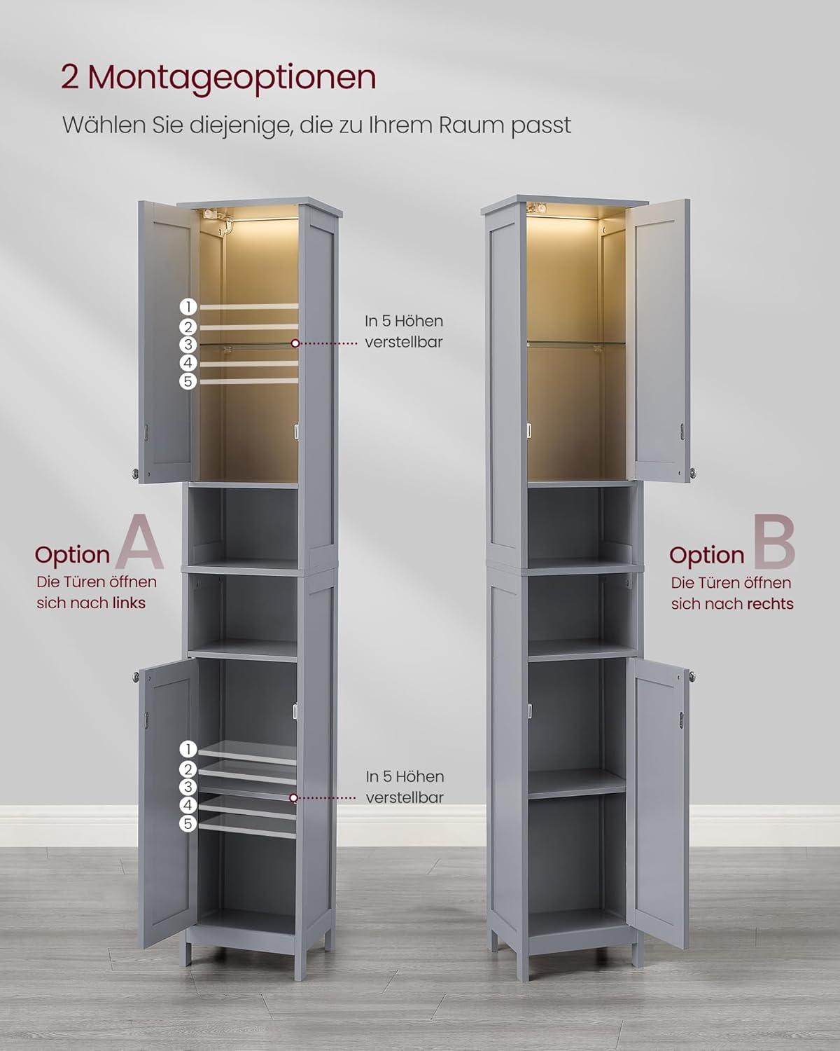 • 2 варианта за монтаж: вратите на този шкаф за баня могат да се отварят наляво или надясно, така че шкафът се вписва във всяко помещение и осигурява оптимален комфорт, независимо как монтирате вратите.