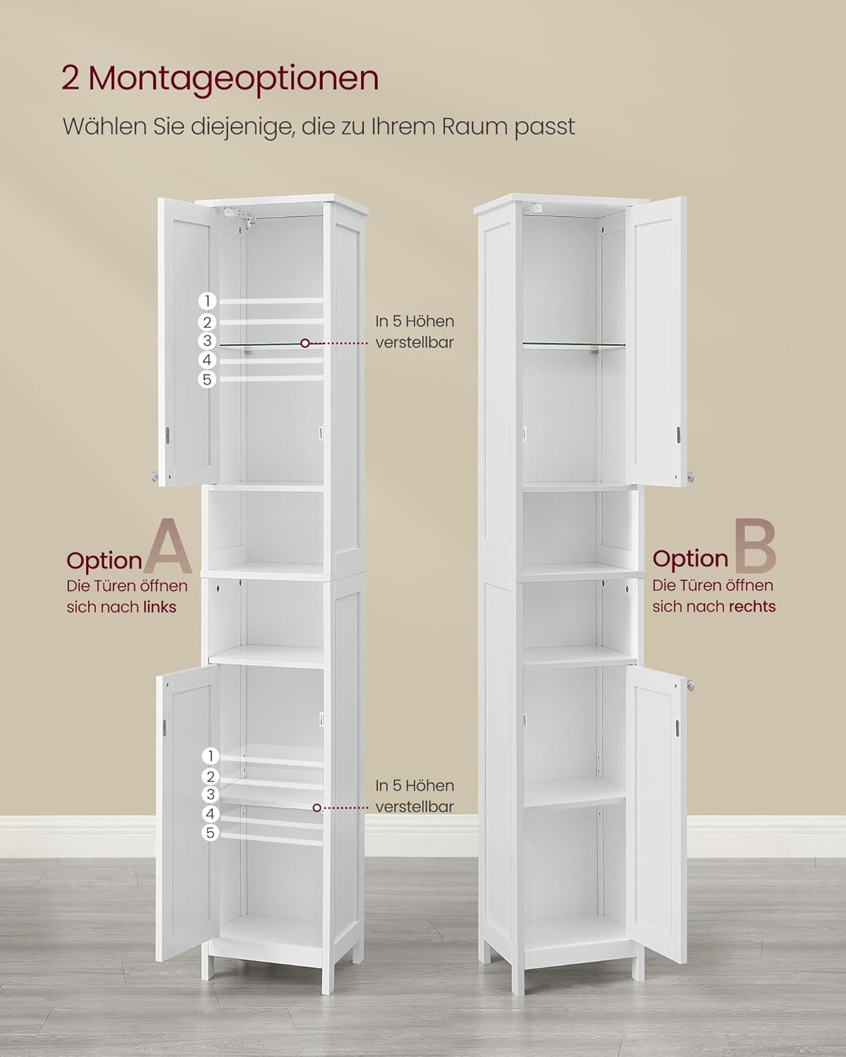 • 2 варианта за монтаж: вратите на този шкаф за баня могат да се отварят наляво или надясно, така че шкафът се вписва във всяко помещение и осигурява оптимален комфорт, независимо как монтирате вратите.