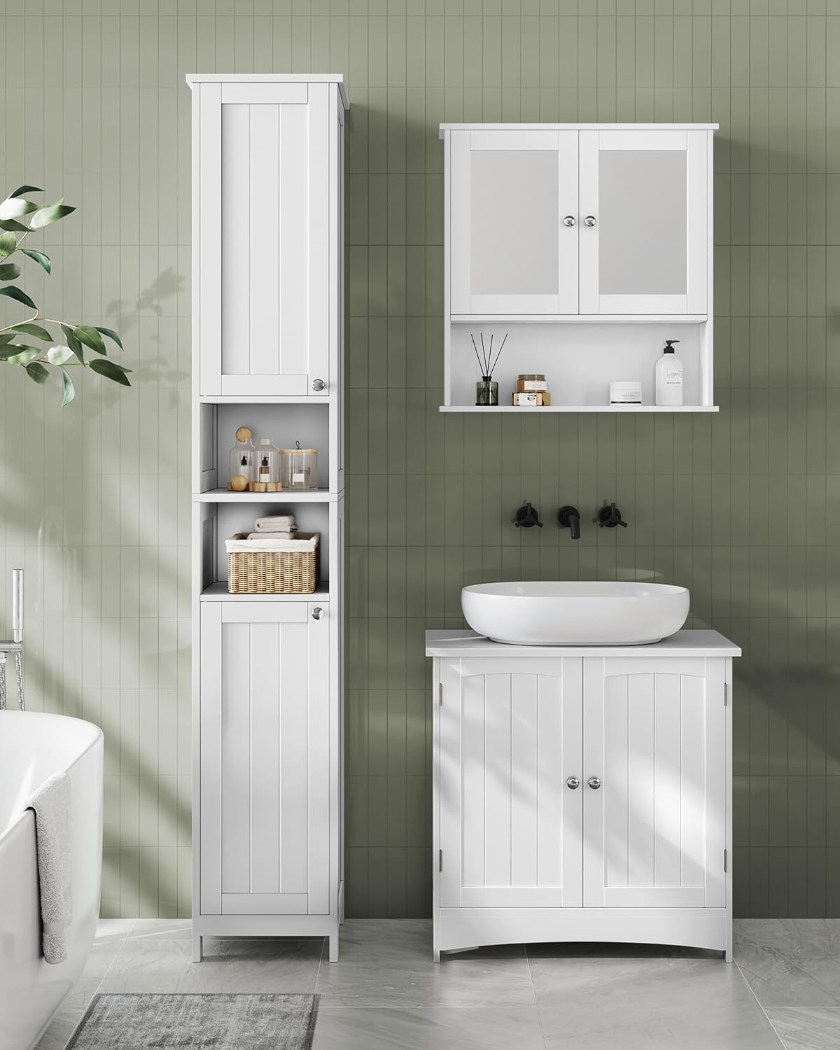 • Лесен за почистване, безопасен за употреба: този висок шкаф за баня е изработен от висококачествен, лакиран MDF (дървесно-влакнести плоскости) и може лесно да се поддържа чист. Включена е и защита от накланяне за сигурно и стабилно закрепване към стената.