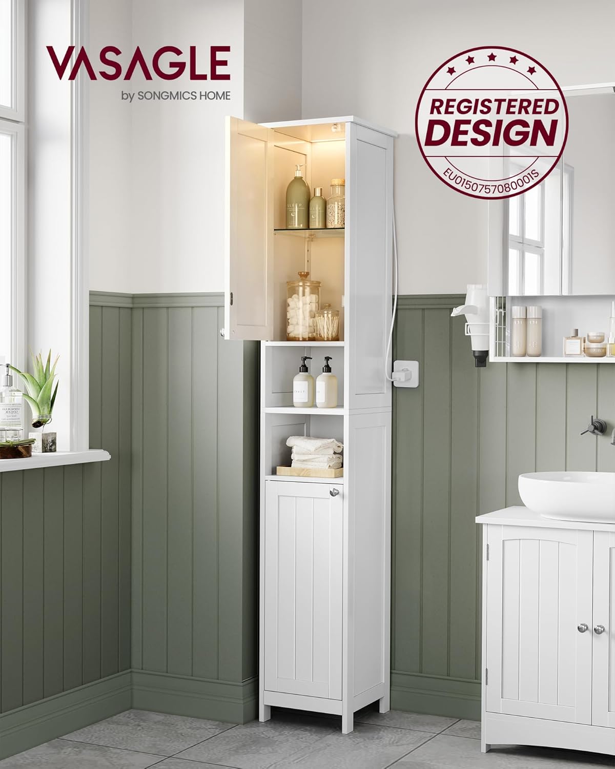 VASAGLE Осветен шкаф за баня, висок, тънък шкаф за съхранение с регулируеми рафтове, отворени отделения, за малки пространства, модерен, облачно бял, BBC566W03