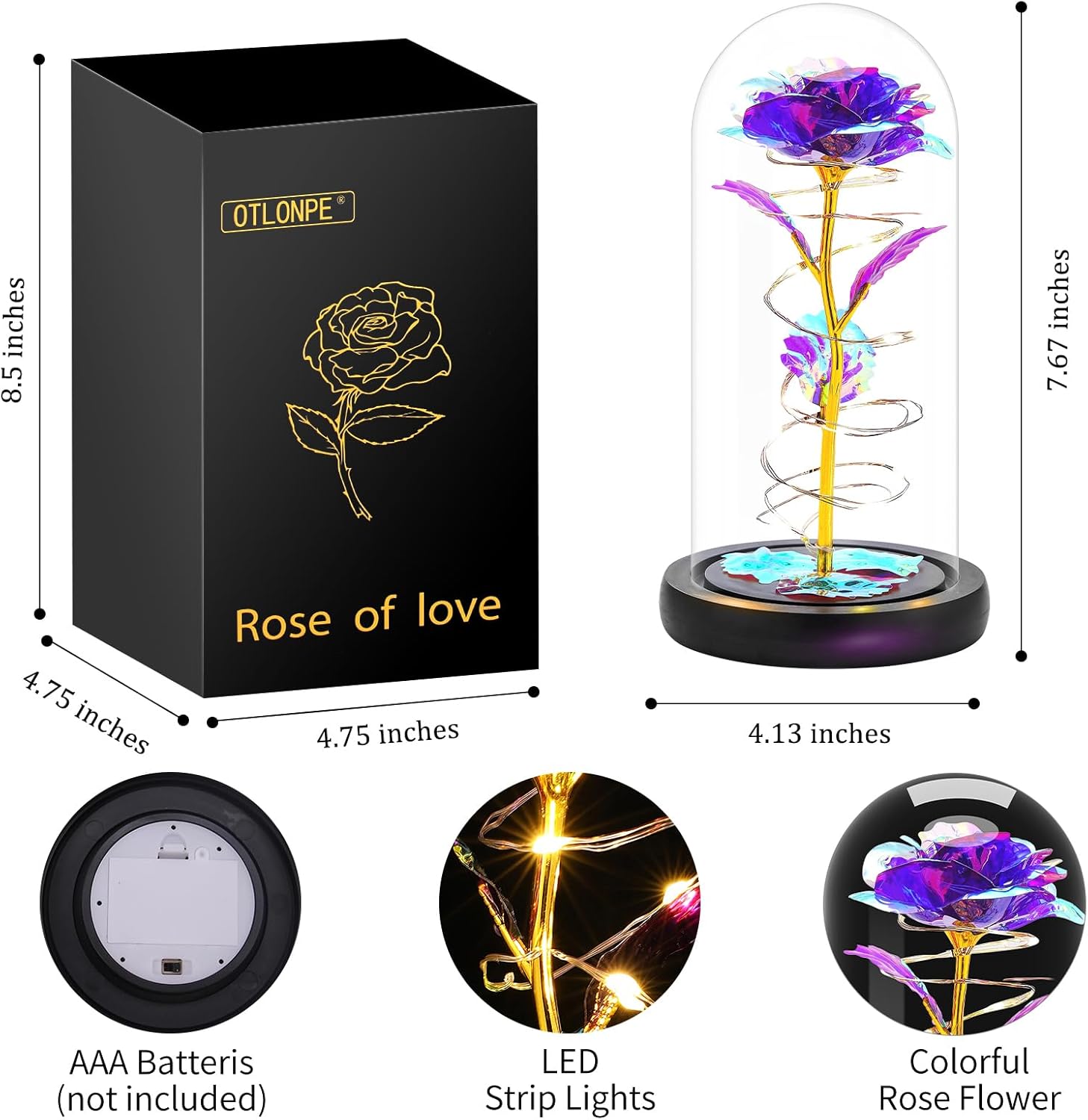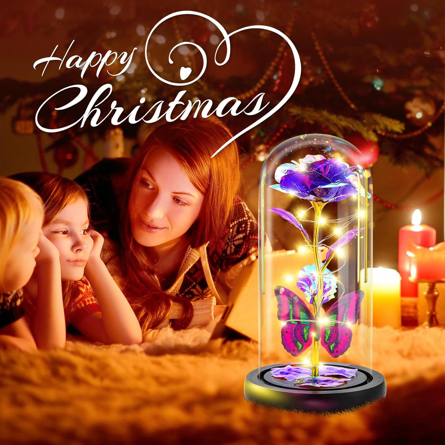 • Вечна роза в стъкло със светлина: Стъкленият купол е изработен от висококачествено боросиликатно стъкло, с ослепителен блясък и кристална чистота. Светлината, обвита около цветни изкуствени рози, излъчва очарователна топла светлина през нощта и ви помага да стоплите сърцето си и да спите комфортно. Отлична за нощното шкафче и плота на масата в спалнята. Романтични коледни подаръци за приятелка/майка/жена/баба.