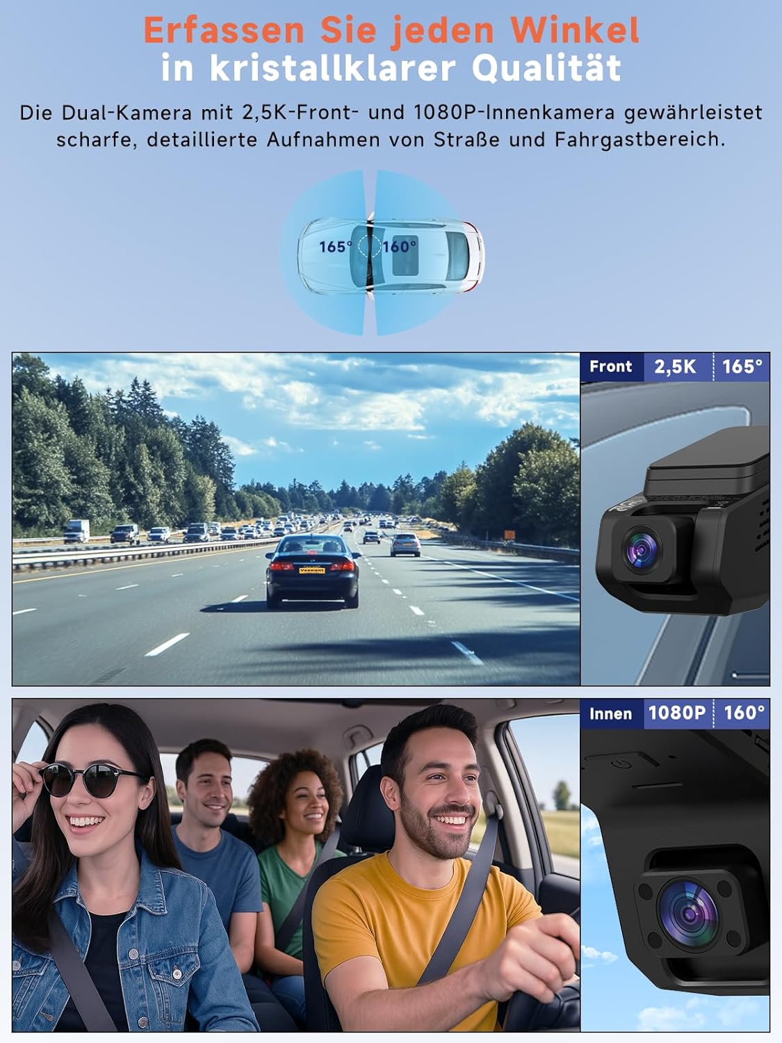 • [2.5K+1080P двойна видеорегистраторна камера за ежедневна употреба] – GT803 разполага с мощна система от две камери с предна камера 2.5K QHD (2560×1440P) и вътрешна камера 1080P FHD за ясни и детайлни записи от двата ъгъла. С широкоъгълни обективи от 165° преден и 160° вътрешен обхват, тя е идеална за пътуващи до работа, пътувания с кола и семейства. Независимо дали записвате пътни условия или събития в автомобила, GT803 осигурява цялостно покритие и подобрена безопасност при шофиране.