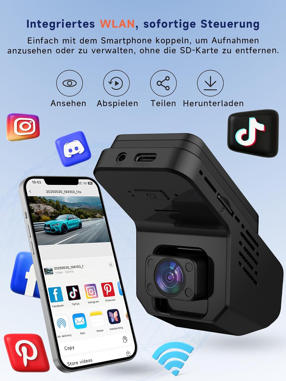 • [Вграден Wi-Fi и управление чрез приложение] – Свържете видеорегистратора GT803 към вашия смартфон чрез 2.4 GHz Wi-Fi и специалното мобилно приложение, за да преглеждате, изтегляте и споделяте лесно видеозаписи. Всички настройки могат да се регулират директно от вашия смартфон. В случай на инцидент, можете незабавно да изпратите записите на полицията или застрахователната компания – без да изваждате SD картата или да използвате компютър.
