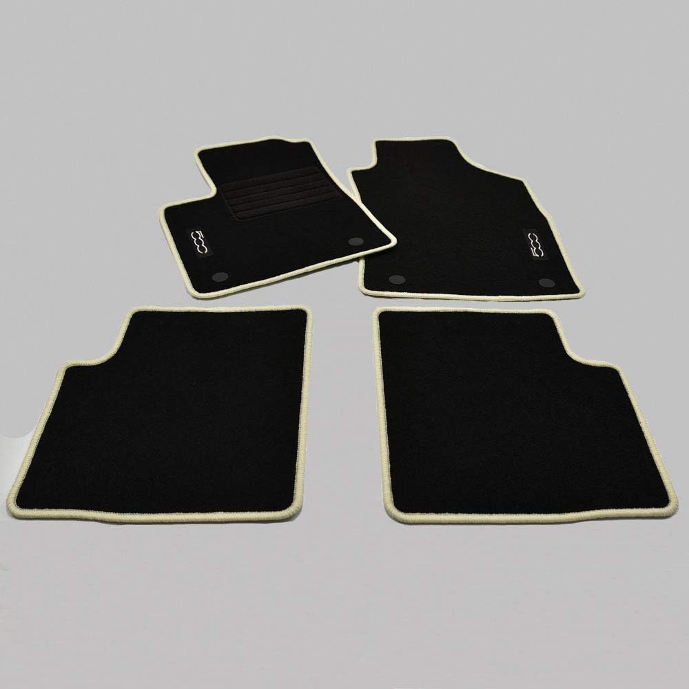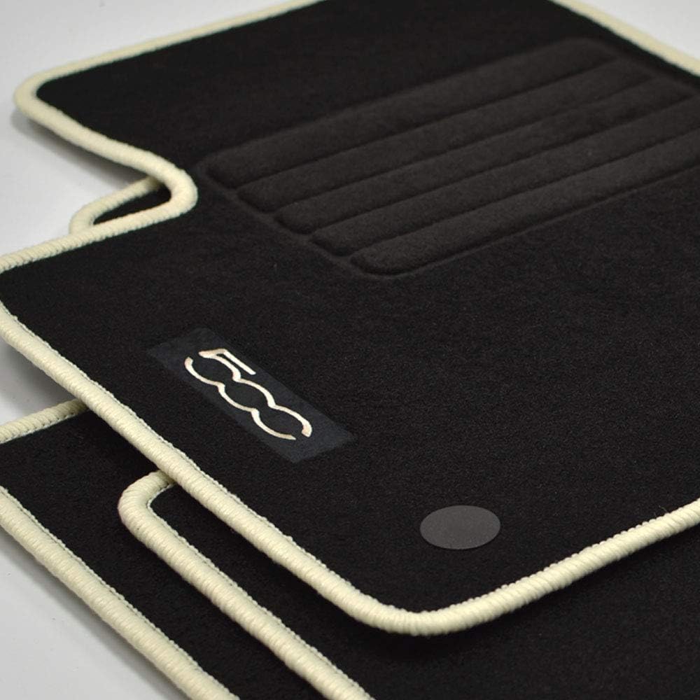 Комплект висококачествени велурени стелки за кола, специално издание, 4 части, 100% оригинални, подходящи за Fiat 500 + Fiat 500 Cabrio (всички модели) от 2013 г. до днес. Обхват на доставката: Комплект велурени стелки от 4 части в черно, с бродирано лого от страната на водача и пътника и черен кант, включително 2 закопчалки на всяка от предните стелки. Качество и предимства: Нашият комплект стелки за кола, с допълнително подсилване на стелката от страната на водача в областта на педалите (протектор за петата), се характеризира със 100% оригинални и много здрави, тествано немско качество. С тегло приблизително 2000 г/м², получавате комплект стелки с перфектно съотношение цена/качество, който отговаря на всички изисквания. Описание на продукта: 100% оригинални, етикет с богата бродерия, водоустойчив, неплъзгащ се гръб, черен мокет, кремав кант, протектори за петата в областта на педалите, фактура с включен ДДС, произведено в Германия, нов артикул в оригинална опаковка, на склад, изпращане веднага
