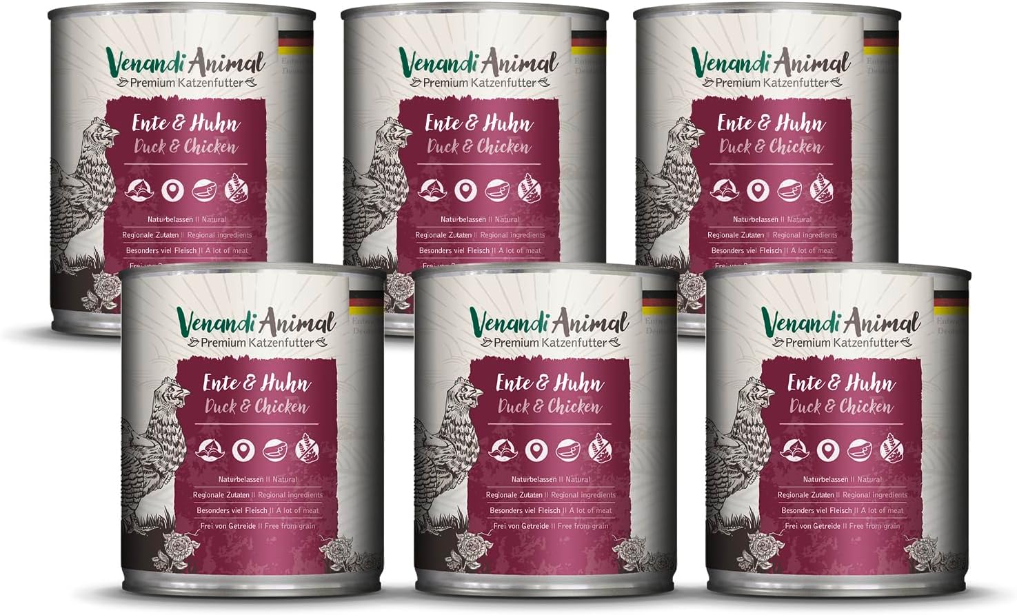 Huhn - Zusammensetzung: Hühnerfleisch, -herz, -leber, -muskelmagen 71 %, Fleischbrühe 28 %, Mineralstoffe 0,5 %, Eierschalen (getrocknet) 0,5 %. Analytische Bestandteile: 11 % Rohprotein, 6 % Fettgehalt, 2,2 % Rohasche, 0,4 % Rohfaser, 79 % Feuchtigkeit, 0,25 % Calcium, 0,2 % Phosphor, 0,15 % Kalium, 0,12 % Natrium. Pute - Zusammensetzung: Putenfleisch, -herz, -leber, -muskelmagen 71 %, Fleischbrühe 28 %, Mineralstoffe 0,5 %, Eierschalen (getrocknet) 0,5 %. Analytische Bestandteile: 11 % Rohprotein, 6 % Fettgehalt, 2,2 % Rohasche, 0,4 % Rohfaser, 79 % Feuchtigkeit, 0,25 % Calcium, 0,2 % Phosphor, 0,15 % Kalium, 0,12 % Natrium. Rind - Zusammensetzung: Rindfleisch, -leber, -lunge, -herz, -euter, -niere 71 %, Fleischbrühe 28 %, Mineralstoffe 0,5 %, Eierschalen (getrocknet) 0,5 %. Analytische Bestandteile: 12 % Rohprotein, 5,5 % Fettgehalt, 2,4 % Rohasche, 0,2 % Rohfaser, 78,5 % Feuchtigkeit, 0,30 % Calcium, 0,25 % Phosphor, 0,15 % Kalium, 0,12 % Natrium. Huhn & Kaninchen - Zusammensetzung: Hühnerfleisch, -mägen, -leber 56%, Fleischbrühe, Kaninchen 14%, Mineralstoffe, Leinöl, Seealgenmehl. Analytische Bestandteile: Rohprotein 11%, Fettgehalt 6,5%, Rohasche 2%, Rohfaser 0,5%, Feuchtigkeit 78%, Calcium 0,30%, Phosphor 0,25%, Kalium 0,15%, Natrium 0,16%. Kalb - Zusammensetzung: Kalbsfleisch, lunge, -herz, -niere, -milz, -leber 70 %, Fleischbrühe 29 %, Mineralstoffe 0,5 %, Eierschalen (getrocknet) 0,5 %. Analytische Bestandteile: 11 % Rohprotein, 5,5 % Fettgehalt, 2 % Rohasche, 0,4 % Rohfaser, 79 % Feuchtigkeit, 0,3 % Calcium, 0,25 % Phosphor, 0,15 % Kalium, 0,12 % Natrium. Truthahn - Zusammensetzung: Truthahnfleisch, -herz, -leber, -muskelmagen 71 %, Fleischbrühe 28 %, Mineralstoffe 0,5 %, Eierschalen (getrocknet) 0,5 %. Analytische Bestandteile: 11 % Rohprotein, 6 % Fettgehalt, 2,2 % Rohasche, 0,4 % Rohfaser, 79 % Feuchtigkeit, 0,25 % Calcium, 0,2 % Phosphor, 0,15 % Kalium, 0,12 % Natrium. Ernährungsphysiologische Zusatzstoffe je kg: 200 IE Vitamin D3, 50 mg Vitamin E (α-Tocopherolacetat), 1.500 mg Taurin, 0,2 mg Jod (als Calciumjodat, wasserfrei), 2 mg Mangan (als Mangan-(II)-Sulfat), 20 mg Zink (als Zinksulfat, Monohydrat). Huhn - Zusammensetzung: Hühnerfleisch, -herz, -leber, -muskelmagen 71 %, Fleischbrühe 28 %, Mineralstoffe 0,5 %, Eierschalen (getrocknet) 0,5 %. Analytische Bestandteile: 11 % Rohprotein, 6 % Fettgehalt, 2,2 % Rohasche, 0,4 % Rohfaser, 79 % Feuchtigkeit, 0,25 % Calcium, 0,2 % Phosphor, 0,15 % Kalium, 0,12 % Natrium. Pute - Zusammensetzung: Putenfleisch, -herz, -leber, -muskelmagen 71 %, Fleischbrühe 28 %, Mineralstoffe 0,5 %, Eierschalen (getrocknet) 0,5 %. Analytische Bestandteile: 11 % Rohprotein, 6 % Fettgehalt, 2,2 % Rohasche, 0,4 % Rohfaser, 79 % Feuchtigkeit, 0,25 % Calcium, 0,2 % Phosphor, 0,15 % Kalium, 0,12 % Natrium. Rind - Zusammensetzung: Rindfleisch, -leber, -lunge, -herz, -euter, -niere 71 %, Fleischbrühe 28 %, Mineralstoffe 0,5 %, Eierschalen (getrocknet) 0,5 %. Analytische Bestandteile: 12 % Rohprotein, 5,5 % Fettgehalt, 2,4 % Rohasche, 0,2 % Rohfaser, 78,5 % Feuchtigkeit, 0,30 % Calcium, 0,25 % Phosphor, 0,15 % Kalium, 0,12 % Natrium. Huhn & Kaninchen - Zusammensetzung: Hühnerfleisch, -mägen, -leber 56%, Fleischbrühe, Kaninchen 14%, Mineralstoffe, Leinöl, Seealgenmehl. Analytische Bestandteile: Rohprotein 11%, Fettgehalt 6,5%, Rohasche 2%, Rohfaser 0,5%, Feuchtigkeit 78%, Calcium 0,30%, Phosphor 0,25%, Kalium 0,15%, Natrium 0,16%. Kalb - Zusammensetzung: Kalbsfleisch, lunge, -herz, -niere, -milz, -leber 70 %, Fleischbrühe 29 %, Mineralstoffe 0,5 %, Eierschalen (getrocknet) 0,5 %. Analytische Bestandteile: 11 % Rohprotein, 5,5 % Fettgehalt, 2 % Rohasche, 0,4 % Rohfaser, 79 % Feuchtigkeit, 0,3 % Calcium, 0,25 % Phosphor, 0,15 % Kalium, 0,12 % Natrium. Truthahn - Zusammensetzung: Truthahnfleisch, -herz, -leber, -muskelmagen 71 %, Fleischbrühe 28 %, Mineralstoffe 0,5 %, Eierschalen (getrocknet) 0,5 %. Analytische Bestandteile: 11 % Rohprotein, 6 % Fettgehalt, 2,2 % Rohasche, 0,4 % Rohfaser, 79 % Feuchtigkeit, 0,25 % Calcium, 0,2 % Phosphor, 0,15 % Kalium, 0,12 % Natrium. Ernährungsphysiologische Zusatzstoffe je kg: 200 IE Vitamin D3, 50 mg Vitamin E (α-Tocopherolacetat), 1.500 mg Taurin, 0,2 mg Jod (als Calciumjodat, wasserfrei), 2 mg Mangan (als Mangan-(II)-Sulfat), 20 mg Zink (als Zinksulfat, Monohydrat).
