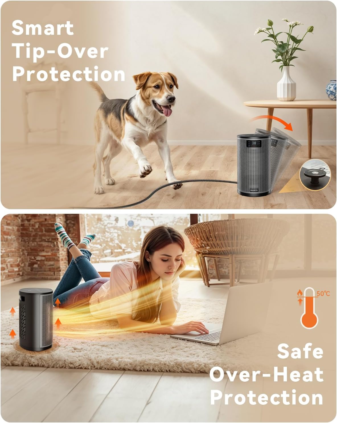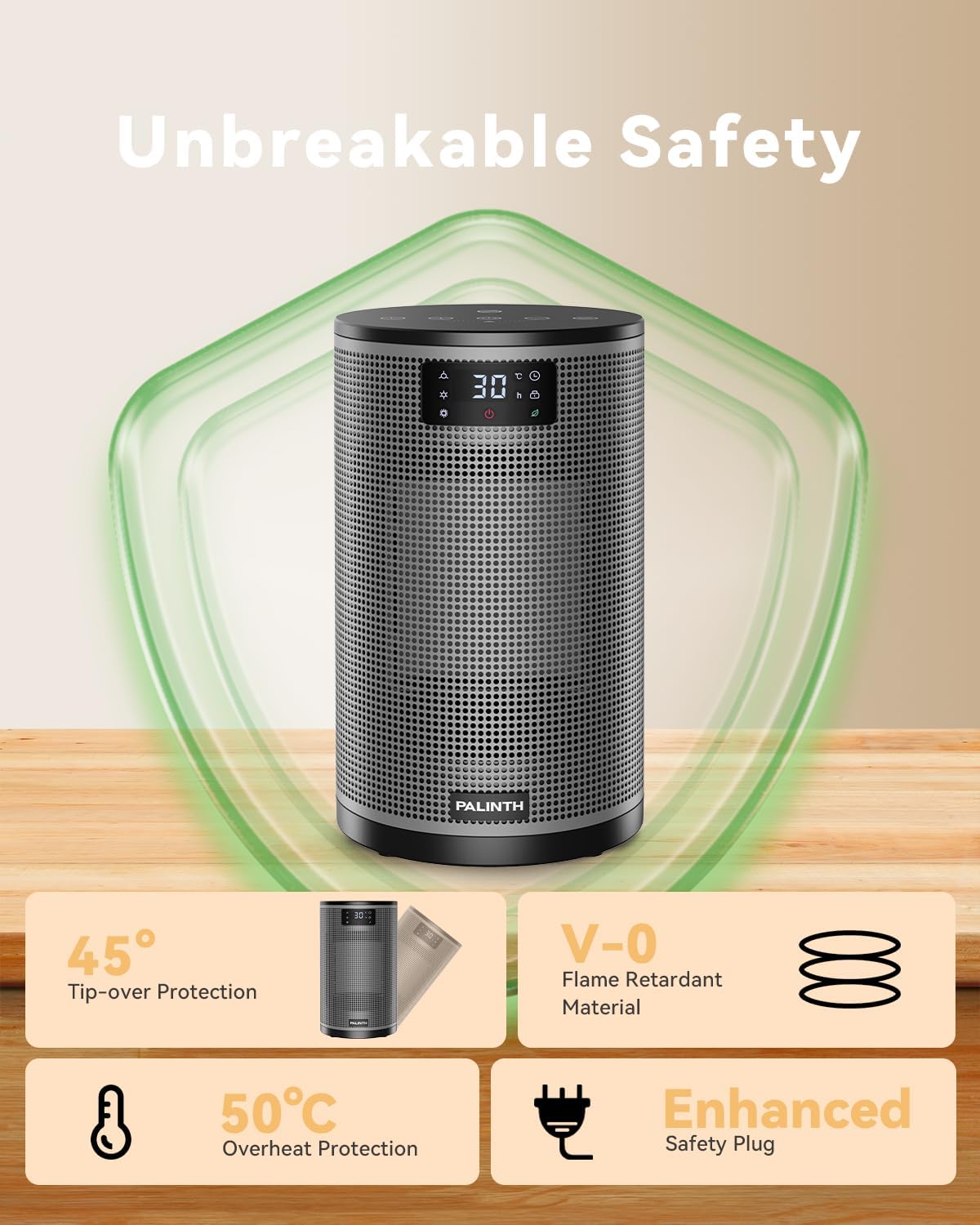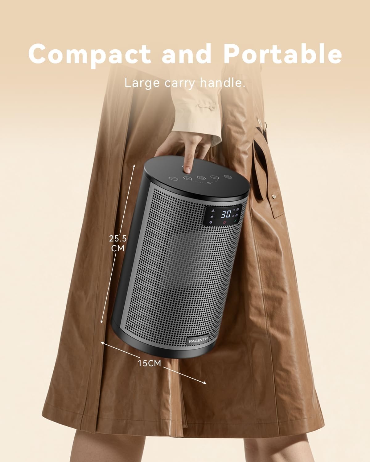 • Моментално затопляне за 2 секунди - Отоплителят PALINTH използва усъвършенствана PTC технология за отопление с мощност 1500 W в комбинация с високоефективен вентилатор. Той осигурява топлина за секунди, ефективно затопля стаята или офиса ви и създава уютна и комфортна атмосфера. Независимо дали работите на бюрото си или релаксирате в кресло, той е вашият надежден партньор за уютна топлина.