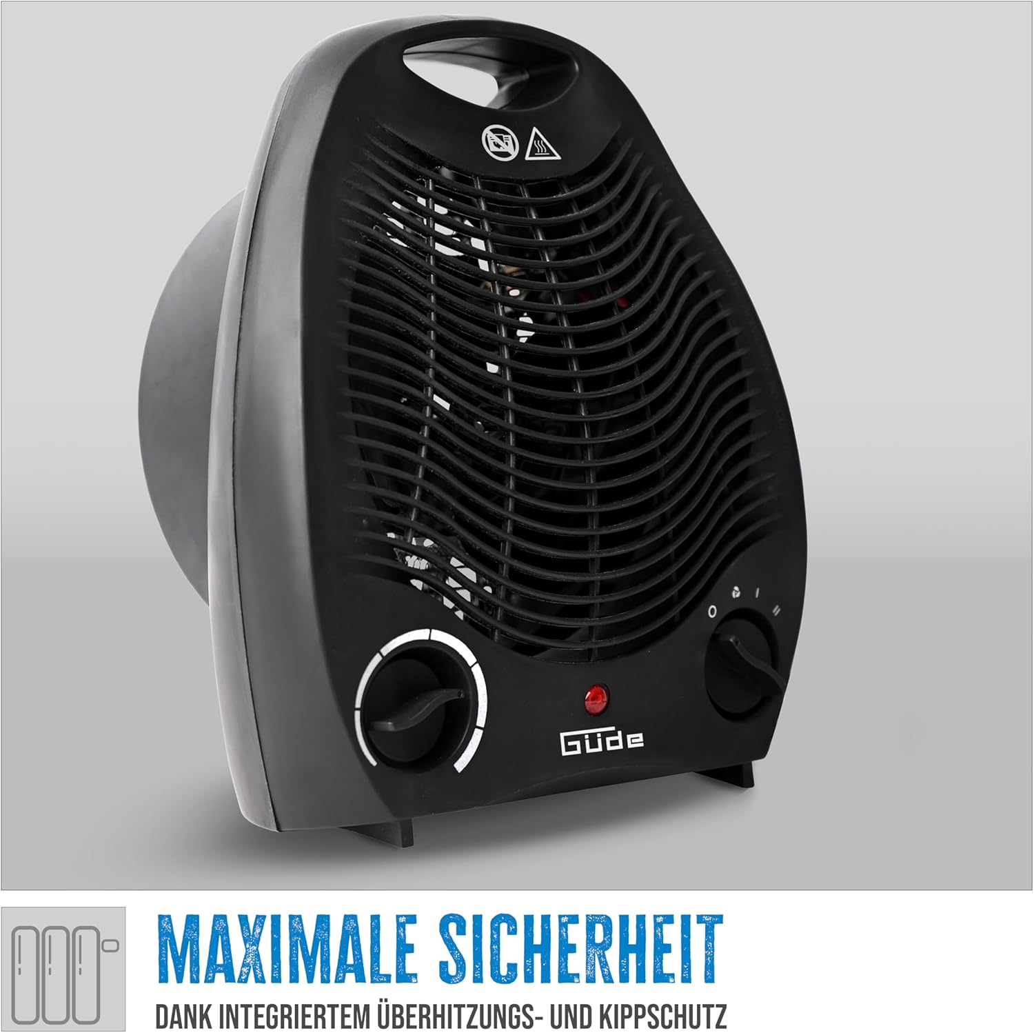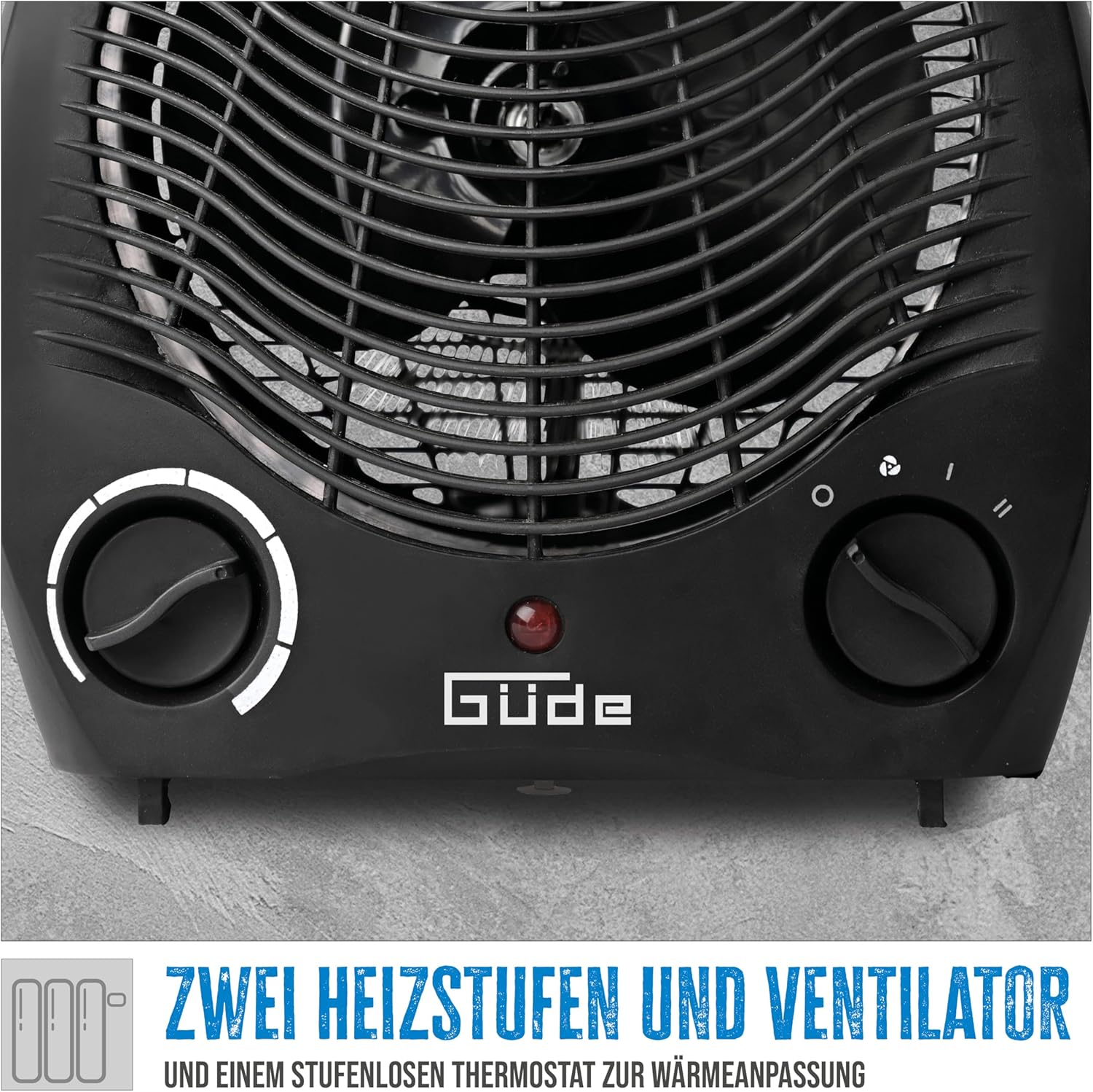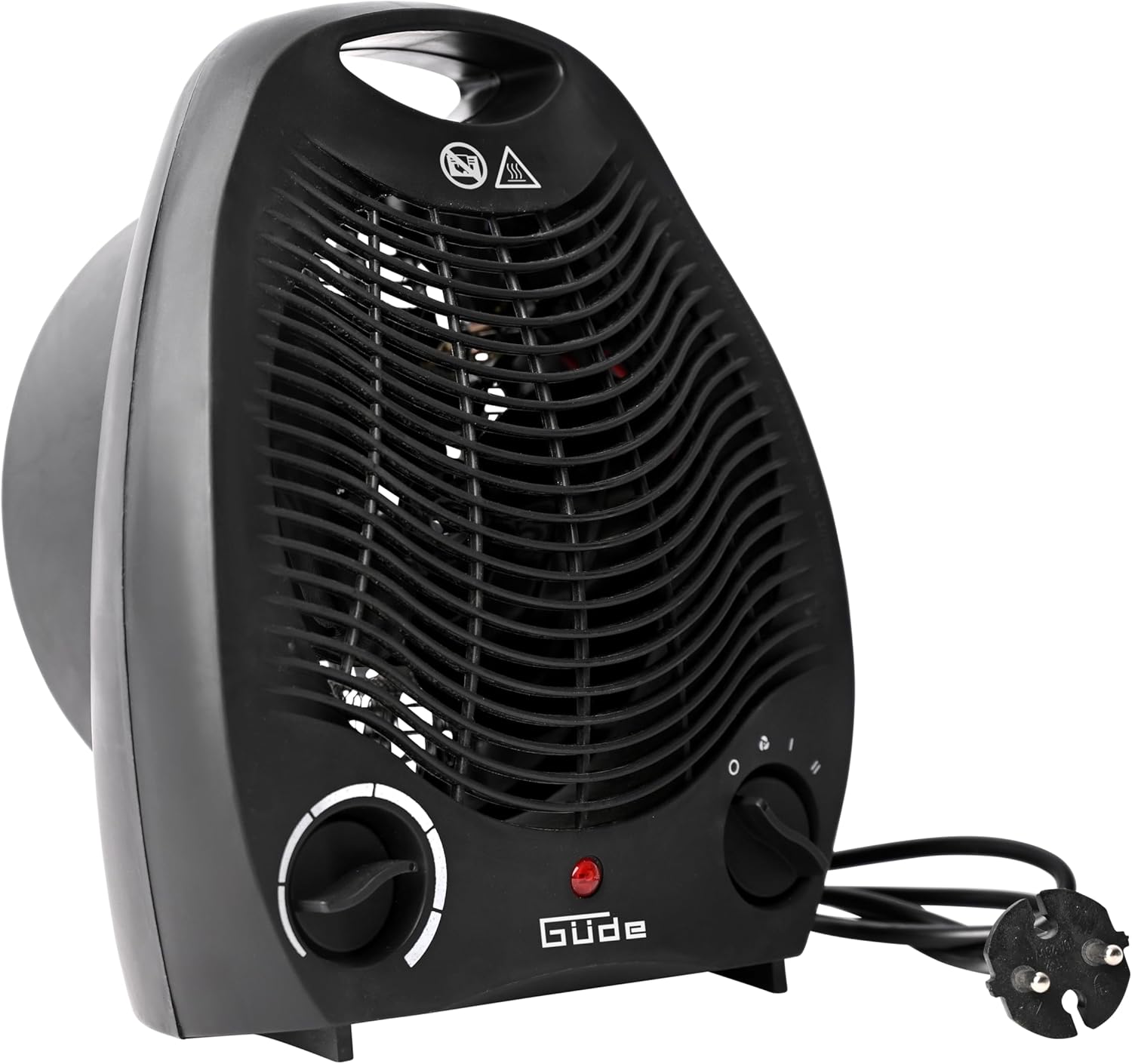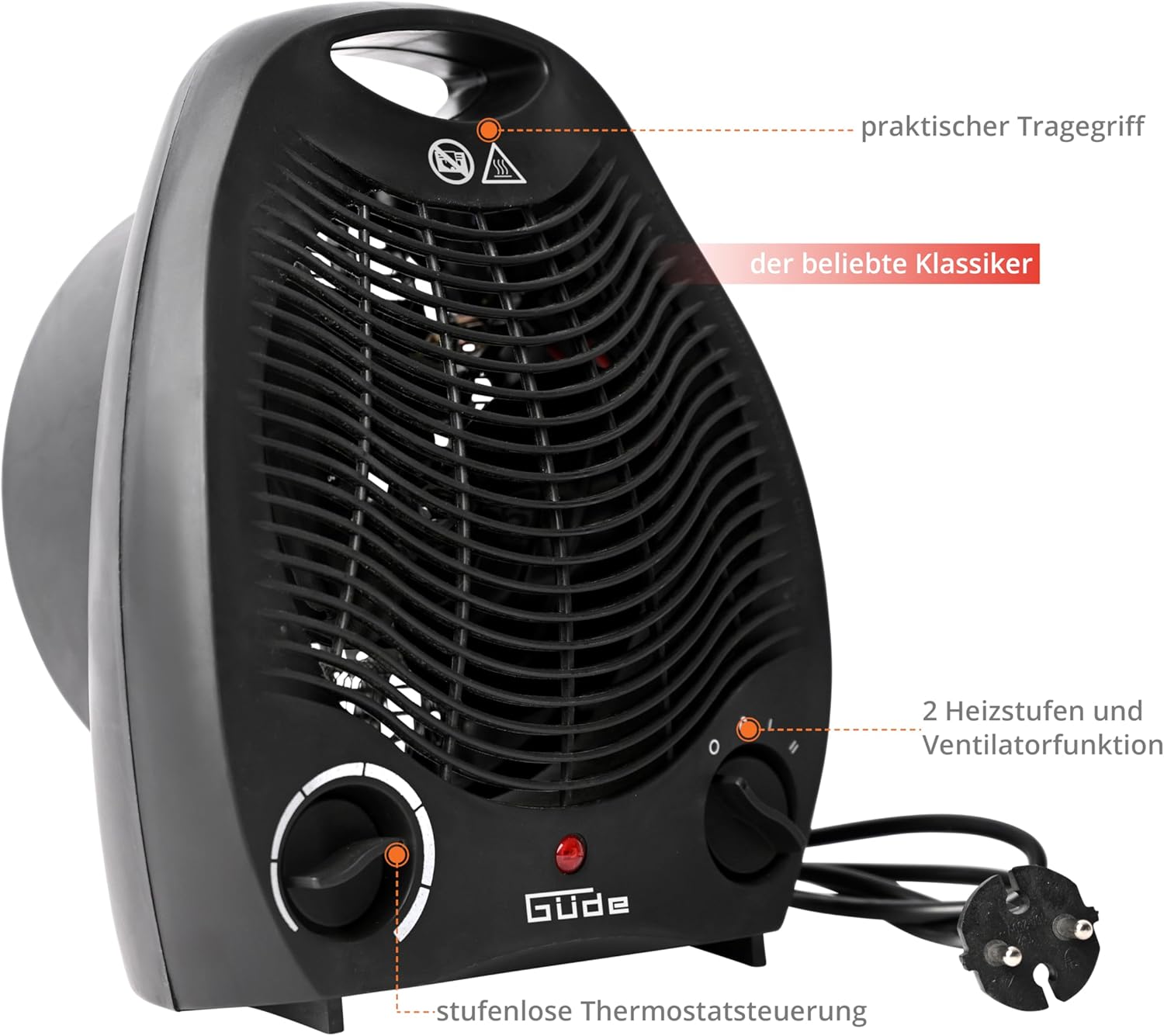 Вентилаторна печка Güde GH 2000 B (220-240 V, мощност 2000 W, 2 степени на нагряване: 1000/2000 W, мощност на вентилатора 75 м³/ч, термостат за непрекъснато регулиране, защита от прегряване и накланяне, дръжка за носене)