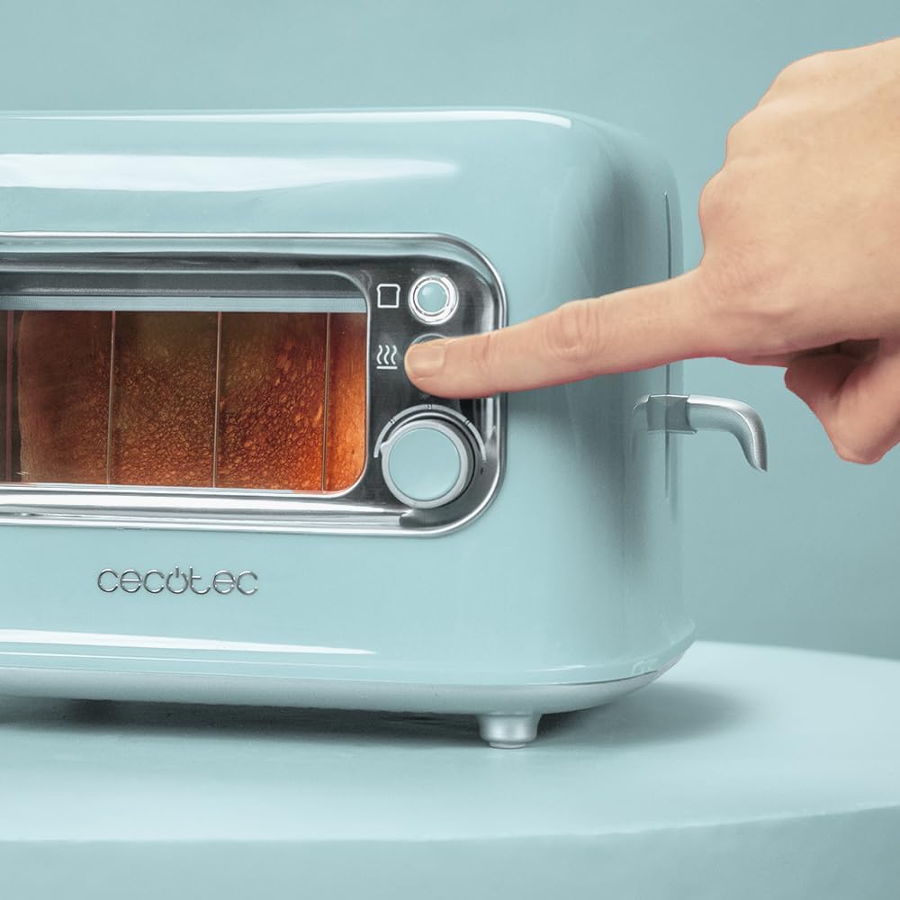 Вертикален тостер Cecotec RetroVision Blue, 2 широки слота, 700 W с 5 настройки, 2 филийки хляб, контролен прозорец, ретро дизайн, капак против прах, автоматично изключване и изскачащо отваряне